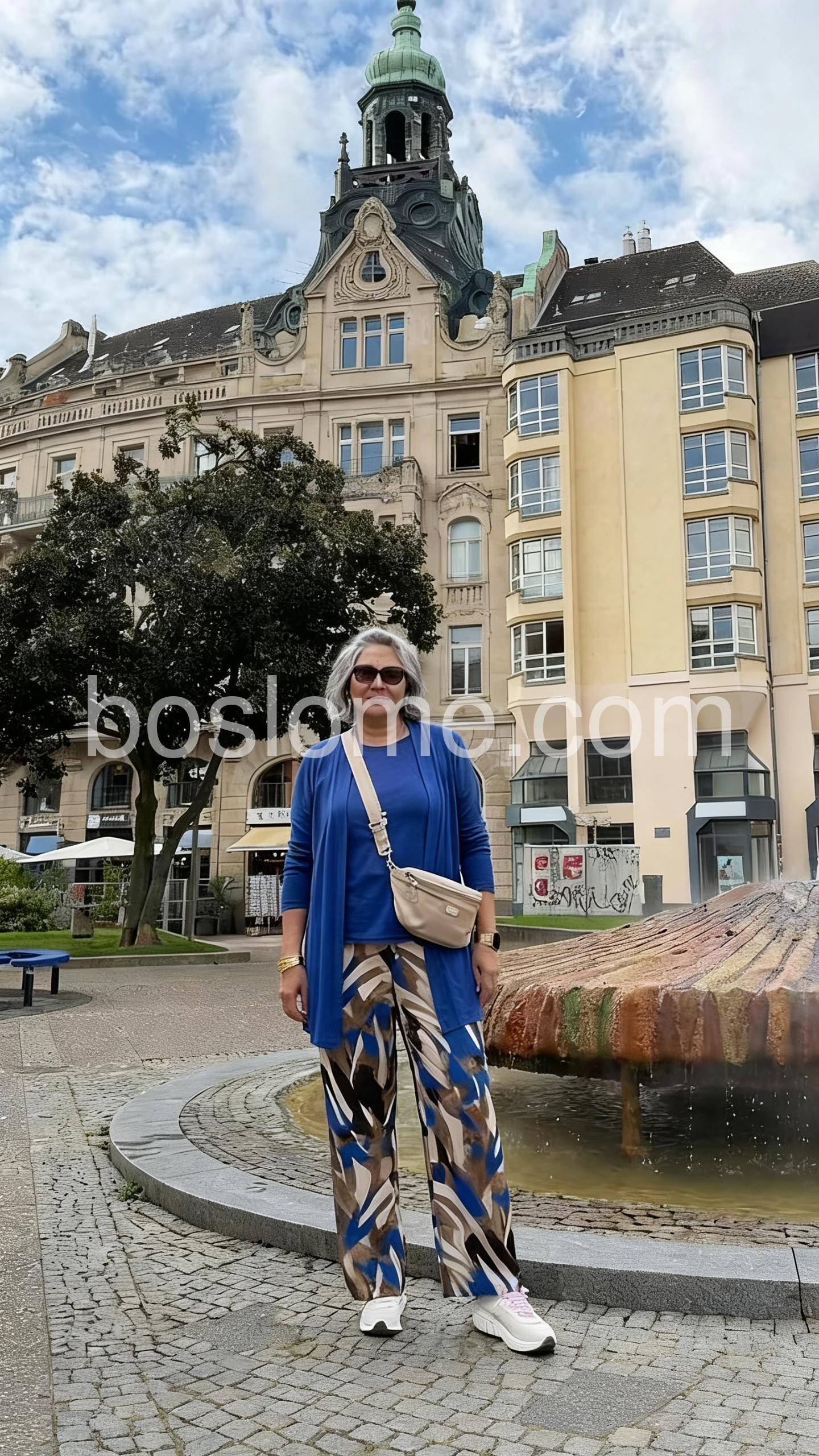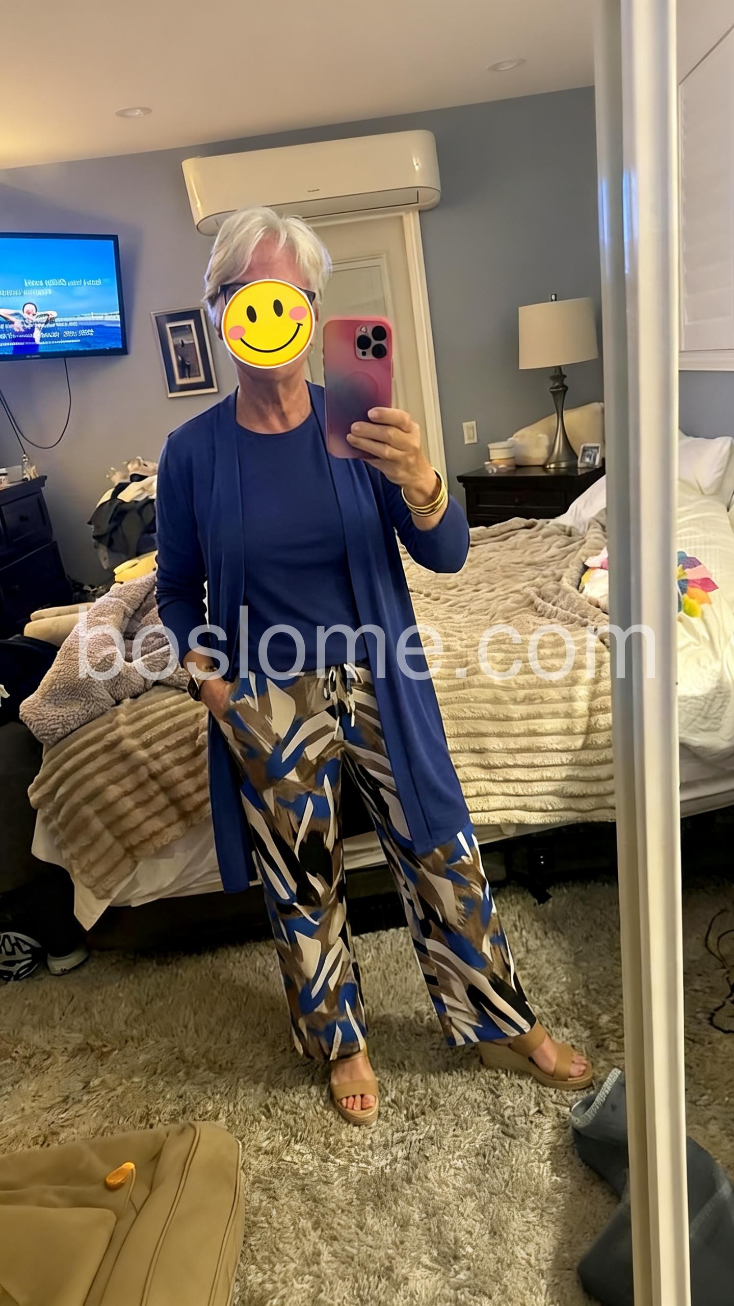 Thisย coordinated outfitย features a sleek blue cardigan over a matching top. The wide-leg palazzo pants have a bold abstract print in blue, beige, and black. Perfect for casual elegance or relaxed outings. Lightweight fabrics ensure comfort all day. Ideal for spring and summer wear.
