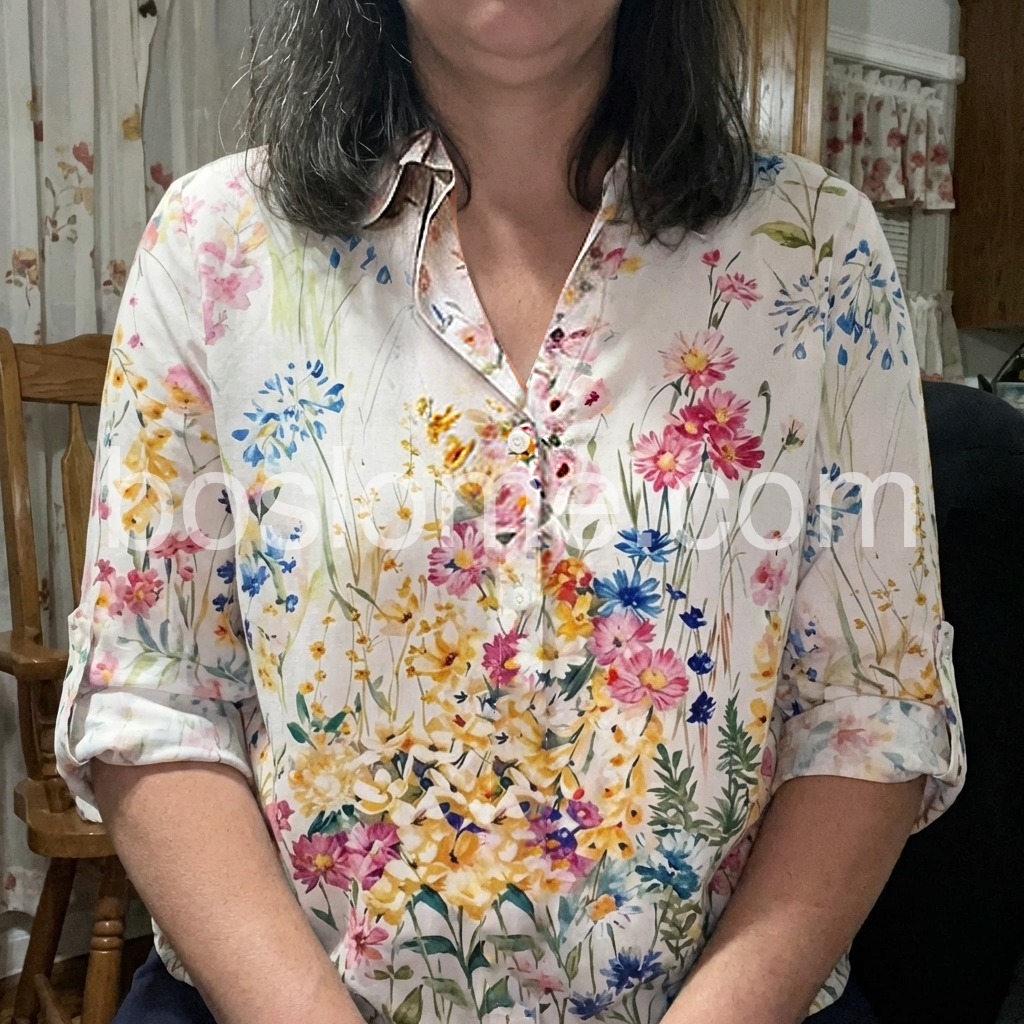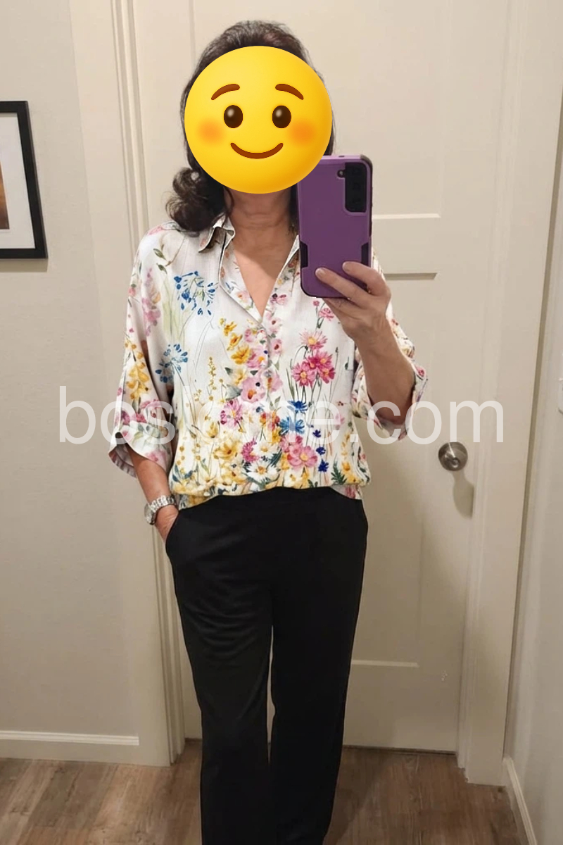 This loose-fit top features a colorful floral print on a soft cream base. V-neck design with a relaxed collar and rolled sleeves adds charm. Lightweight fabric perfect for spring and summer. Pair with jeans or shorts for a fresh look. Effortlessly stylish with a boho vibe.