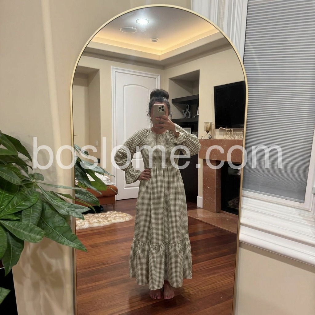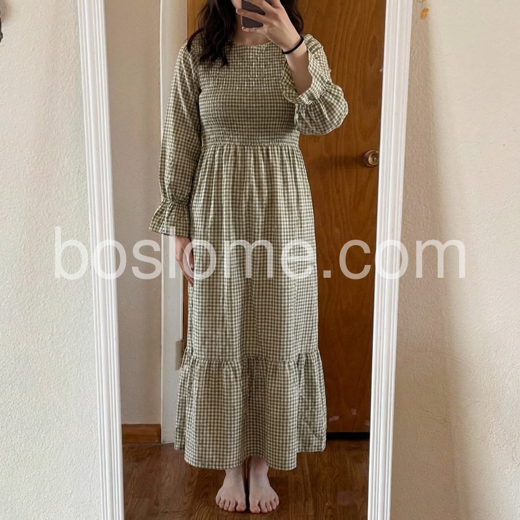 Such a flattering fit! The stretchy top portion makes it fit like a glove, and the skirt flows beautifully when you walk. The green and white check is very subtle and earthy. I paired it with a wicker basket bag just like the model and felt so chic.