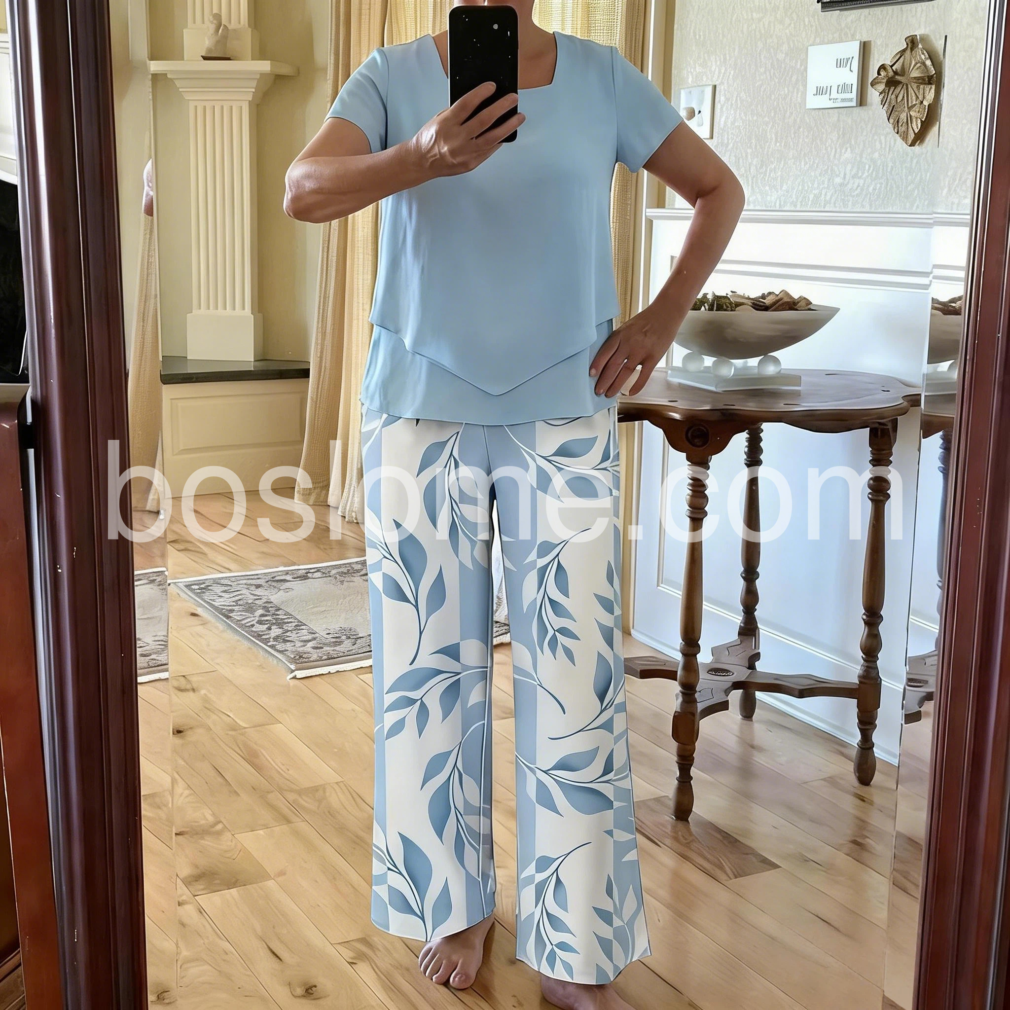 This set is perfect for summer! The material is incredibly lightweight and breathable. The wide-leg pants flow beautifully, and the matching blue top is very flattering. I wore it on my cruise vacation and got so many compliments.