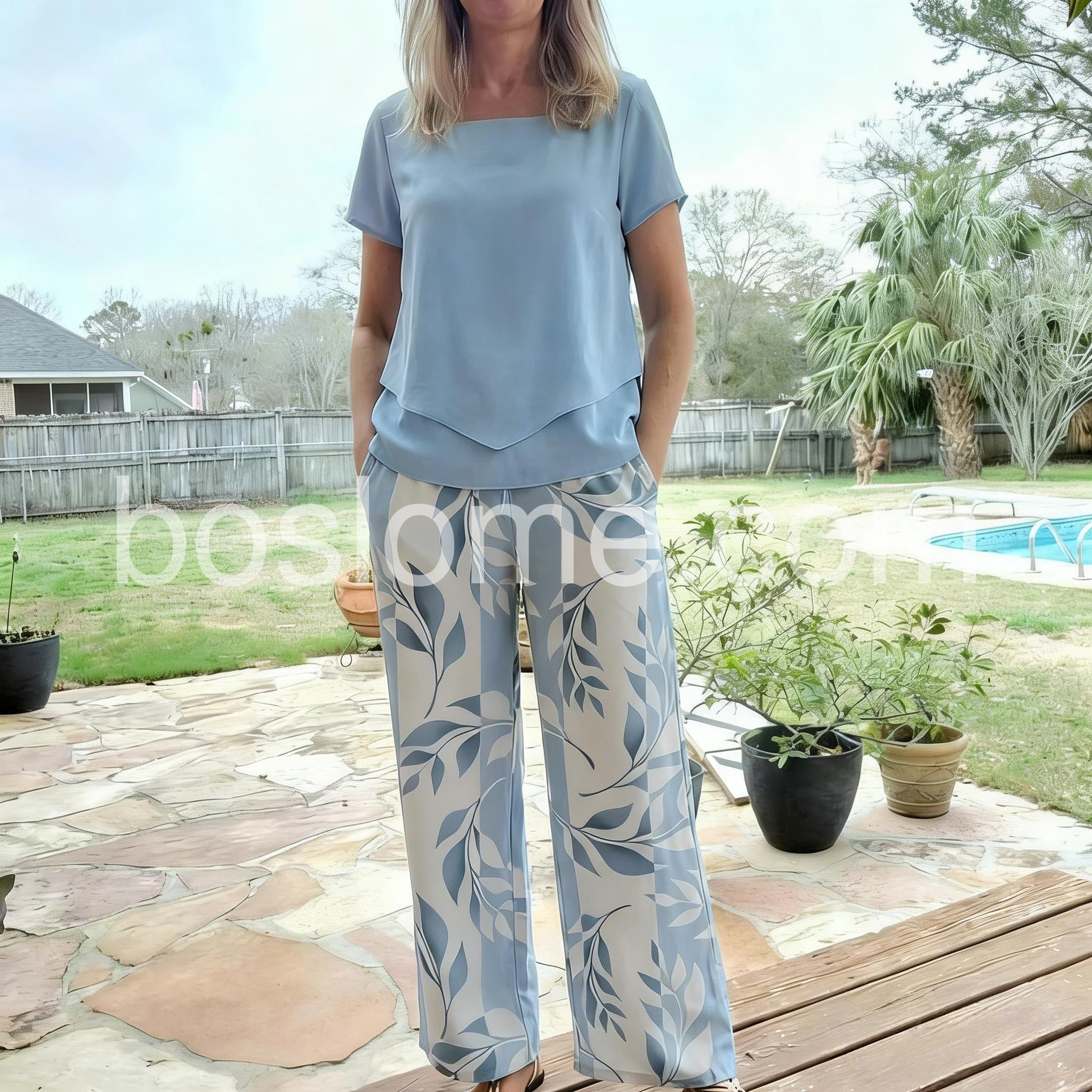 This two-piece set features a relaxed-fit top with a layered hem. Paired with wide-leg pants in a soft leaf print. Lightweight and breathable fabric perfect for warm days. Ideal for casual outings or lounging. Stylish and effortless.