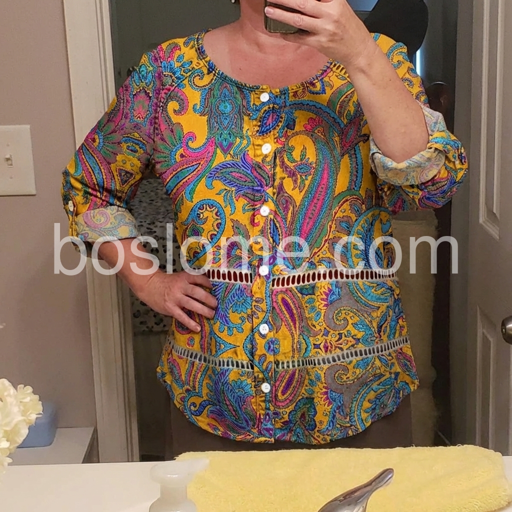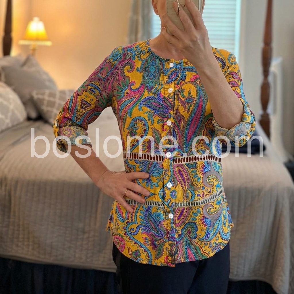 Thisย long-sleeve tunicย features a rich yellow base with colorful paisley patterns. The front button design adds vintage charm. Relaxed fit and rolled sleeves for comfort. Perfect for casual wear or bohemian styles. Pair with jeans or leggings for effortless flair.