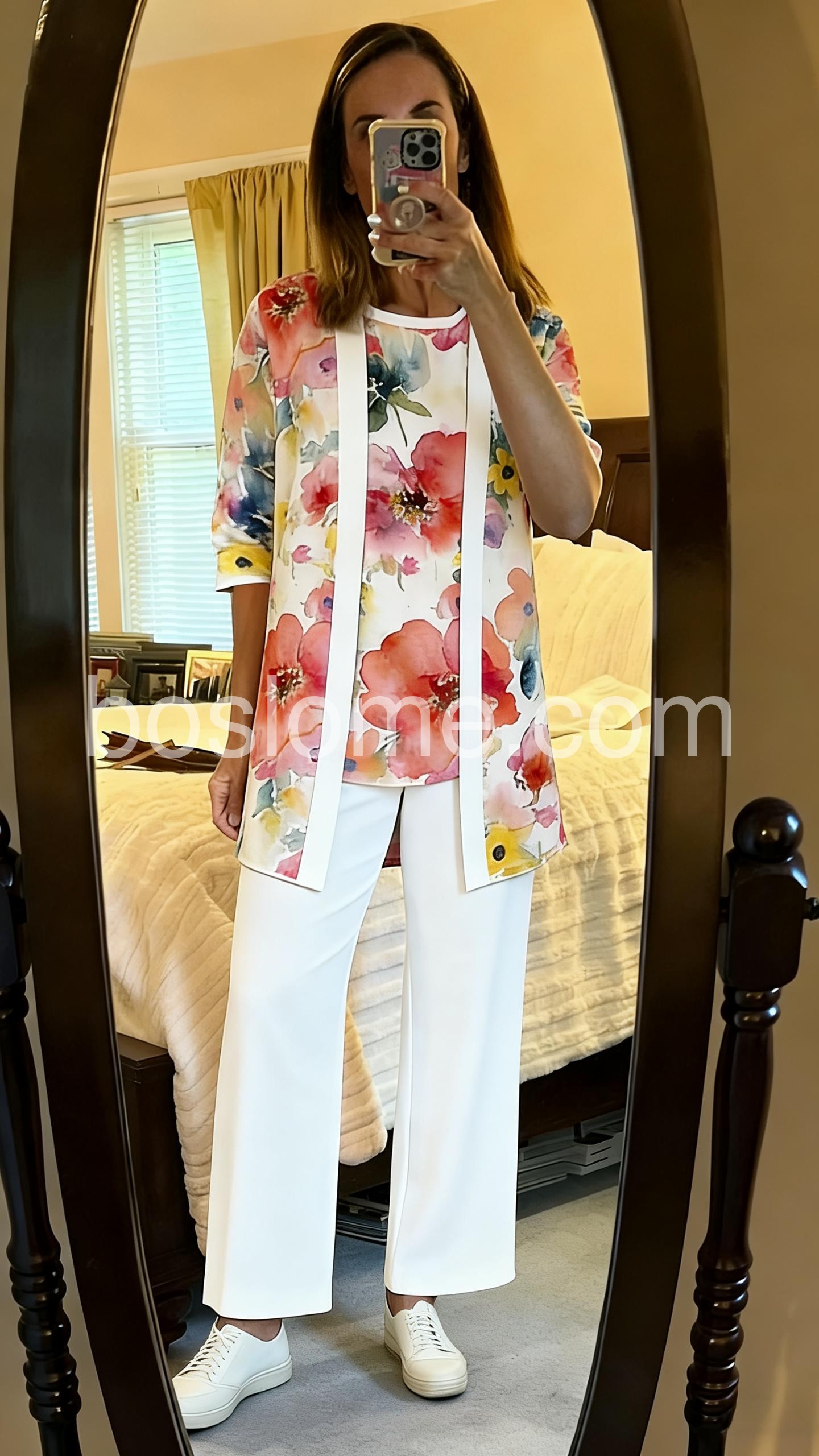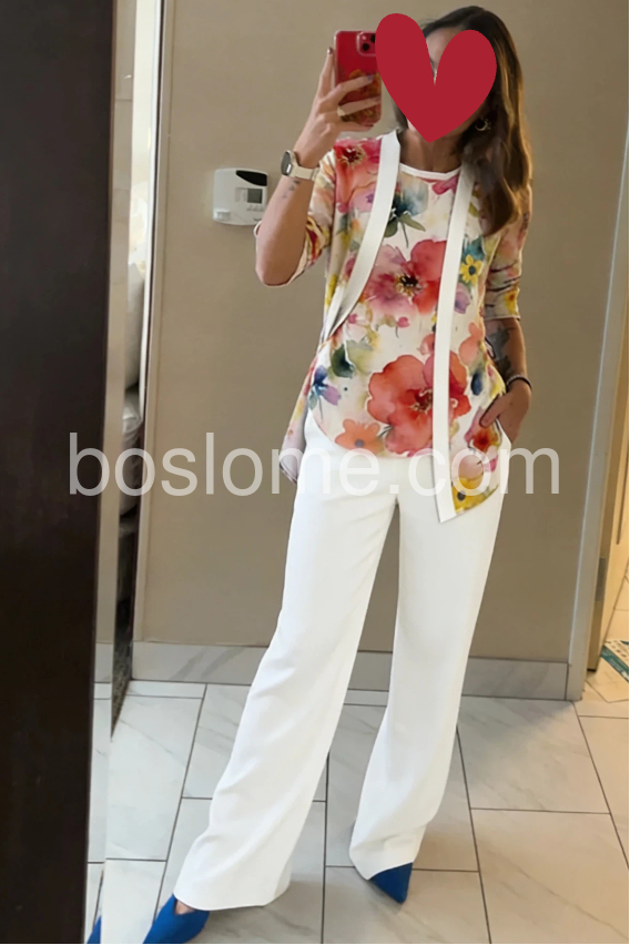 Thisย three-piece setย features a vibrant floral top and matching cardigan with white wide-leg pants. The relaxed fit offers comfort and elegance. Perfect for spring or summer occasions. Lightweight fabric ideal for casual outings. Effortlessly chic and coordinated.