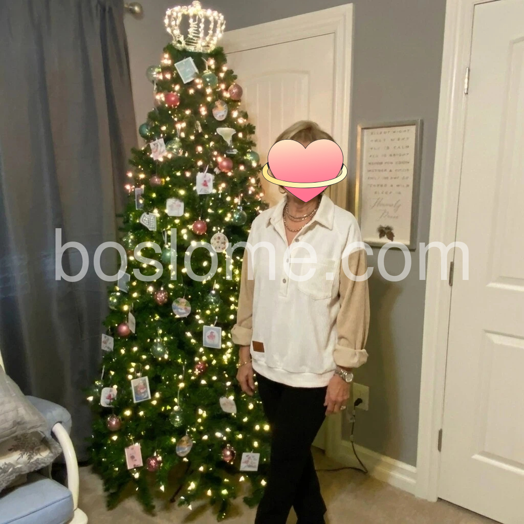 This is such a cute top. I love the contrasting sleeves (cream/tan) with the solid white front—it gives it a unique, stylish look. The buttons lay nicely and the fit is flattering while still being comfortable. It works really well with dark pants and looked great in the Christmas setting. Overall, the quality seems great and it matches the photos well.