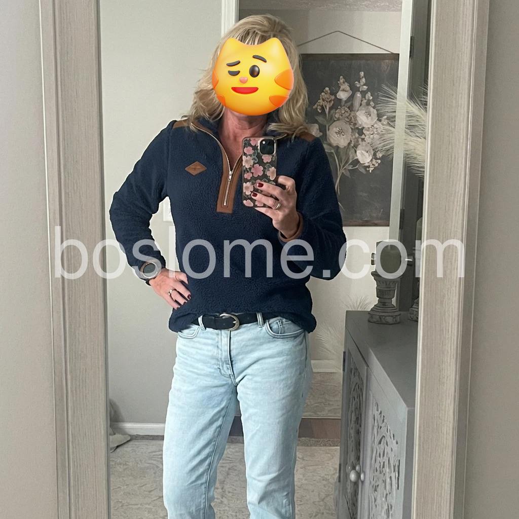 I’m obsessed with this fleece top! The texture is so soft and fuzzy, it feels like wearing a cloud. The contrast between the deep navy fleece and the warm brown leather details is so eye-catching. The half-zip neckline is easy to pull on and off, and the fit is flattering—neither too tight nor too loose. It’s perfect for weekend hikes, coffee runs, or just lounging at home. The quality is amazing for the price, and it washes well without pilling.