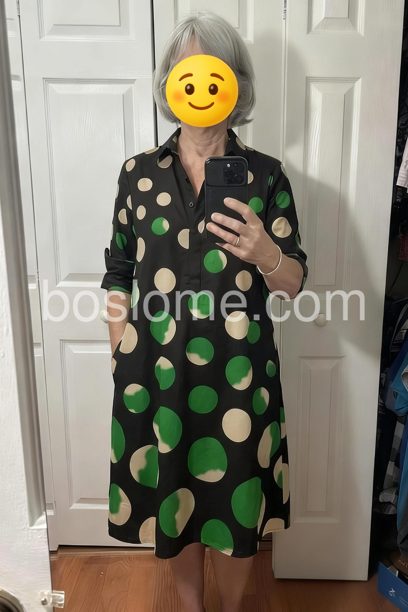 Elevate your casual style with this chic polka dot midi dress. The classic shirt collar, 3/4 sleeves and pockets offer a timeless, polished look.