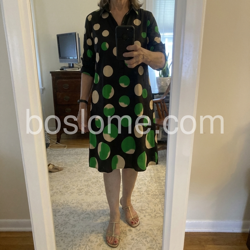 I wore this dress to an afternoon wedding and felt so chic. The bold circle pattern is eye-catching but sophisticated. I love that I can unbutton the top a bit for a v-neck look. It is lightweight, making it great for hot weather.