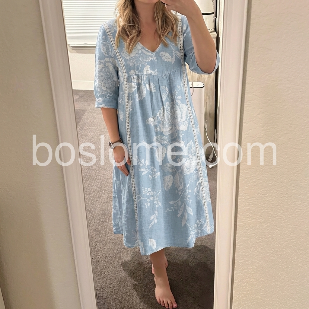 I absolutely love this dress! The light blue color is so pretty for spring, and the white floral pattern gives it a great boho vibe. Best part? It has pockets! The fit is loose and very forgiving, making it incredibly comfortable for all-day wear.