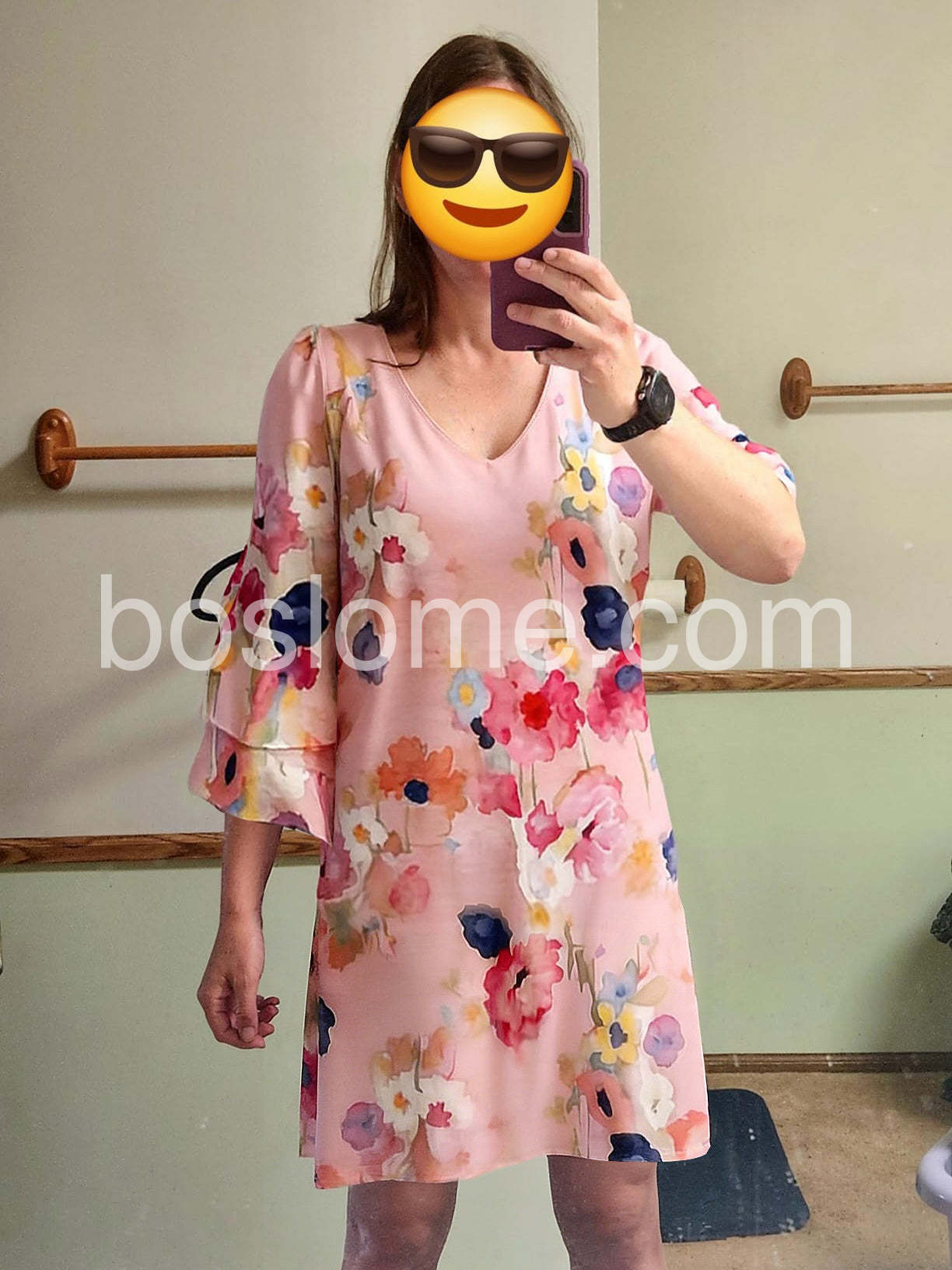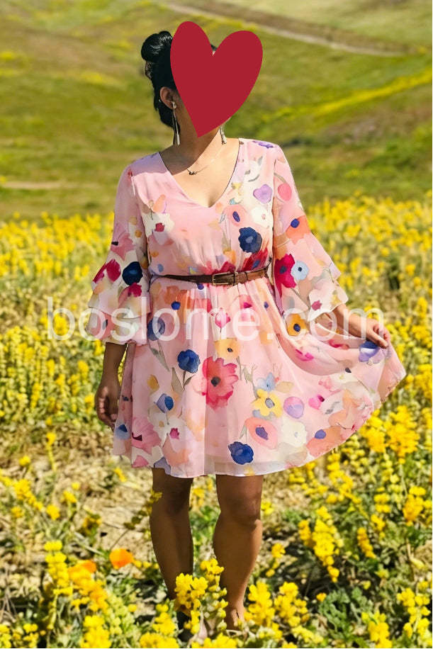 Style# 1544501Embrace soft romance and effortless style in this Pink Watercolor Floral 3/4 Sleeve Mini Dress , a dreamy mini dress that captures the beauty of blooming spring. Crafted from lightweight, flowing fabricโlikely chiffon or rayon blendโthis dress features a delicate watercolor-inspired floral print in vibrant shades of pink, coral, navy, yellow, and white, creating a painterly effect across the soft blush base. The flattering V-neckline adds a touch of elegance, while the short ruffle sleeves bring playful volume and feminine charm. A relaxed, A-line silhouette ensures comfort and ease, making it perfect for casual days, brunches, or warm-weather outings. Paired here with layered bracelets and a pearl necklace, it exudes boho-chic appeal. Ideal for beach trips, garden parties, or weekend strolls, this dress brings a sense of lightness, joy, and timeless femininity to your wardrobe. Let this floral mini dress turn every moment into a gentle celebration of color and style.