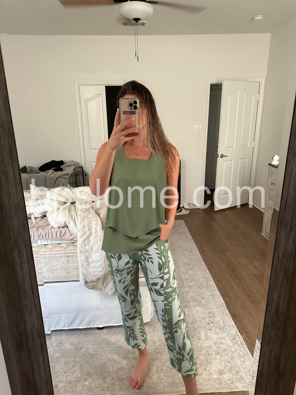This contemporary two-piece set features a playful green plant print and a stylish square neckline. Crafted with high-quality materials, it offers both comfort and fashion. Perfect for any occasion, this set is designed to elevate your wardrobe and make a statement.
