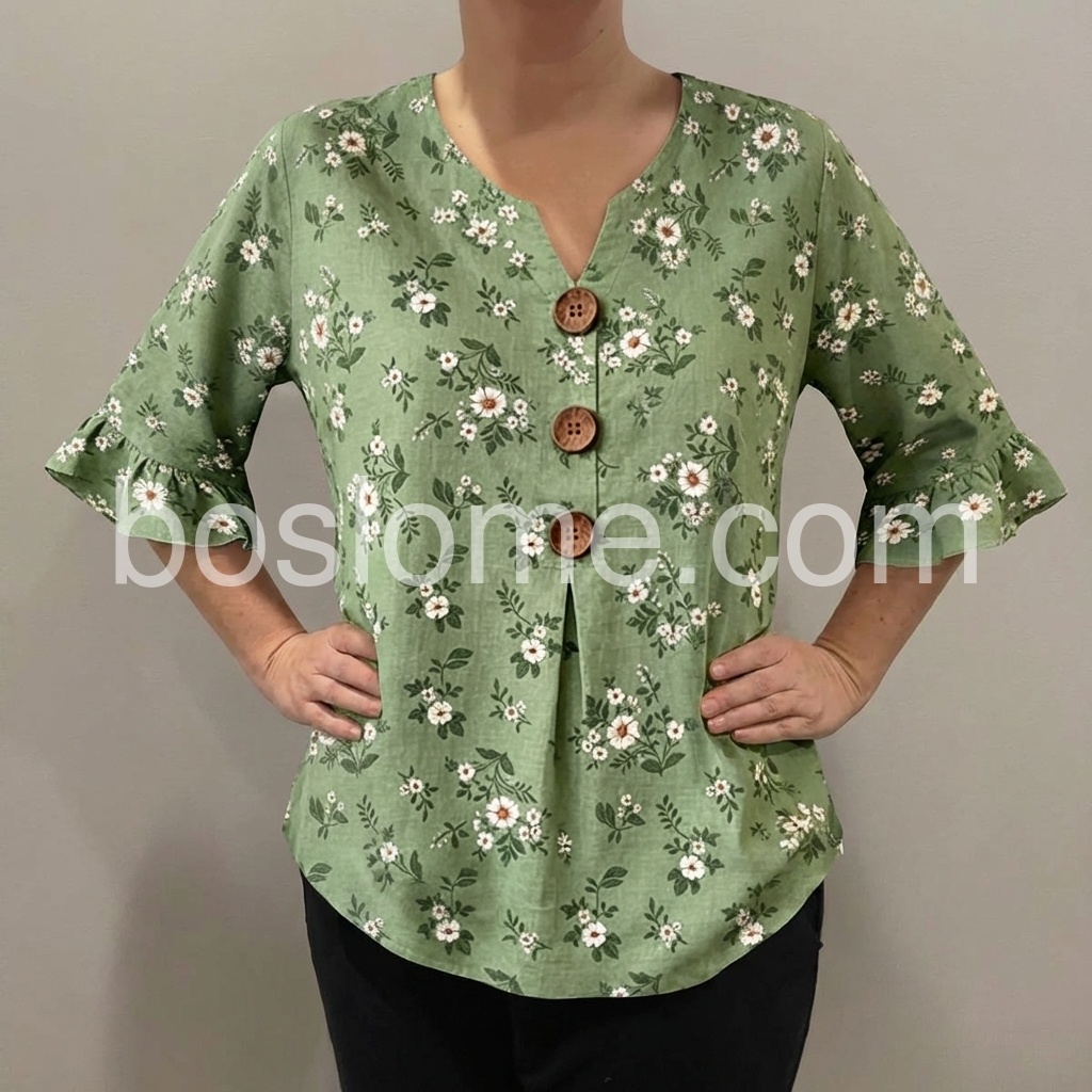 This blouse was created to bring soft, feminine charm to your everyday wardrobe. The delicate floral print on muted green feels fresh and timeless, never going out of style.