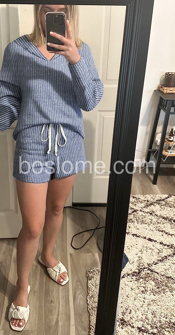 I am obsessed with this lounge set. It hides my tummy area perfectly without looking overly baggy. The shorts are a great length, not too short and not too long. Very flattering and chic!