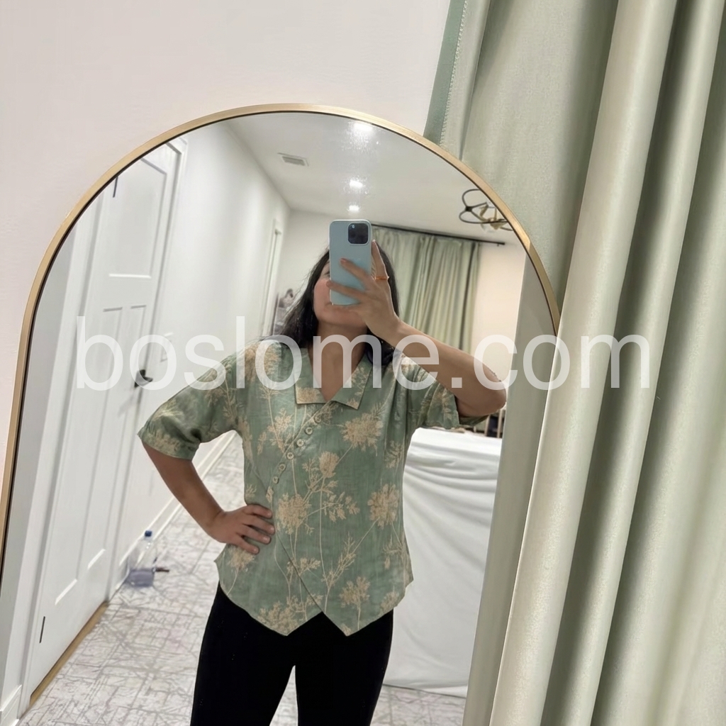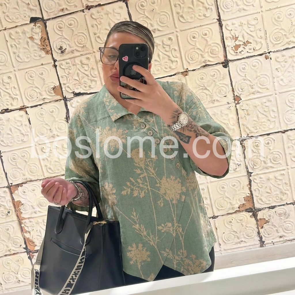 This blouse is so unique! The floral pattern is subtle and elegant. I was pleasantly surprised by the quality of the fabric, it feels like a nice linen blend. The pointed hem adds a nice touch of style. Definitely a new favorite in my wardrobe.