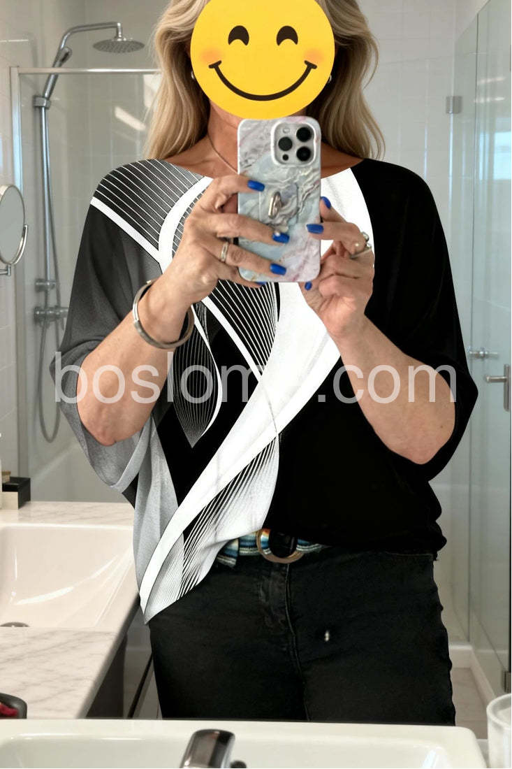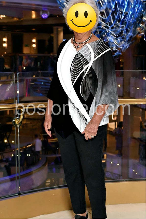 Refresh your attire with this modern geometric long-sleeve tunic top. Black and white swirls give it an abstract style complemented by an asymmetrical uneven hem and long sleeves for added coverage. Wear slacks or jeans and take your day look into the night.