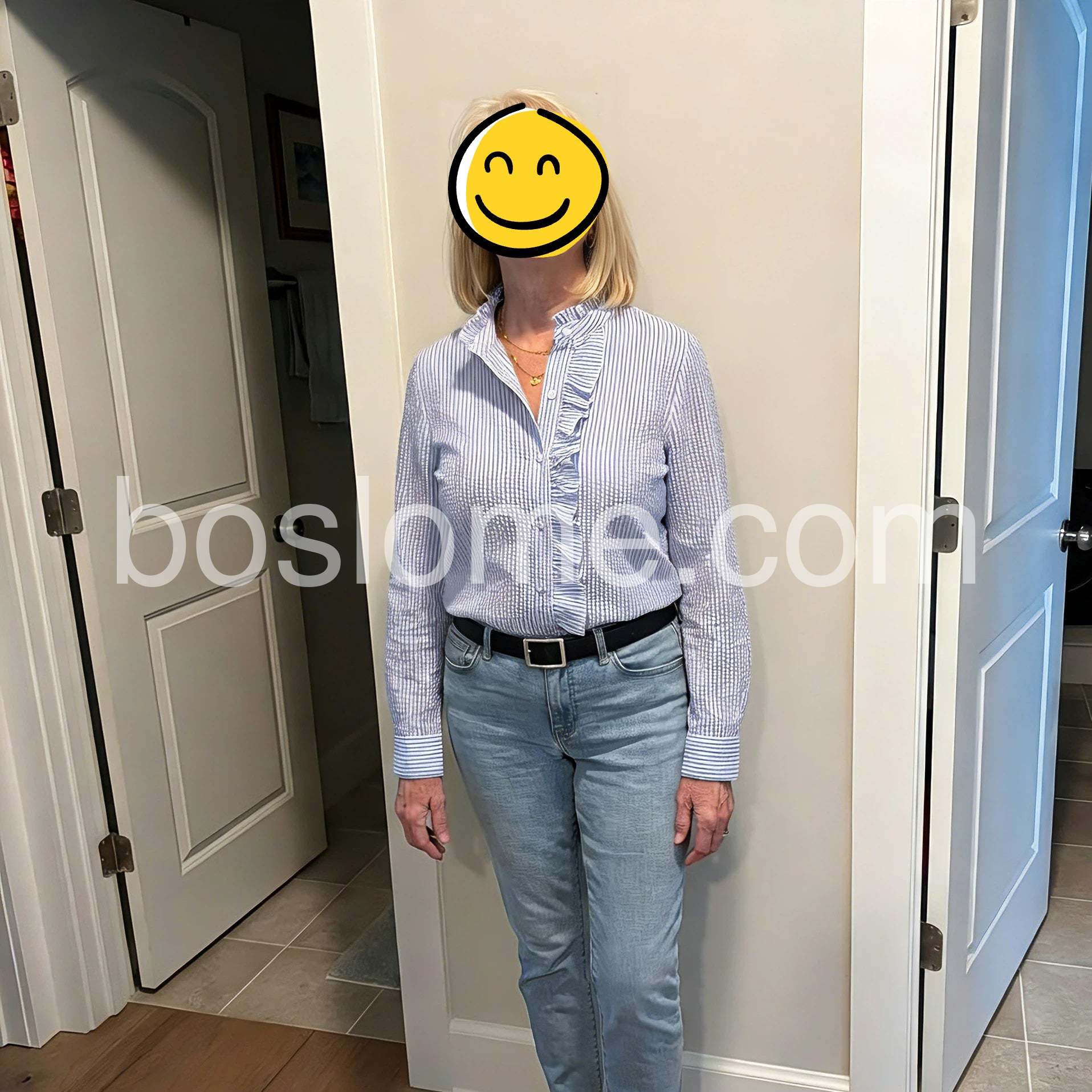 The blouse has a timeless appeal with a fresh twist. The ruffled front adds texture without overpowering the simple stripe pattern. I styled it with light-washed jeans and a slim belt for a relaxed, fashion-forward weekend look. The long sleeves can be rolled up easily, making it adaptable for both cooler mornings and warmer afternoons.