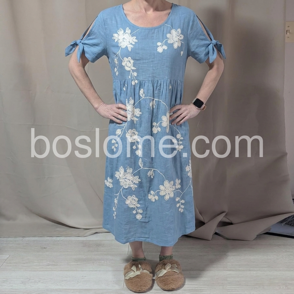 Designed to fix the "boring summer dress" pain point, this dress features intricate floral embroidery that elevates basic linen. The tie sleeves solve the "arm fat" concern, while the flowy tiered hem skims over hips and thighs.