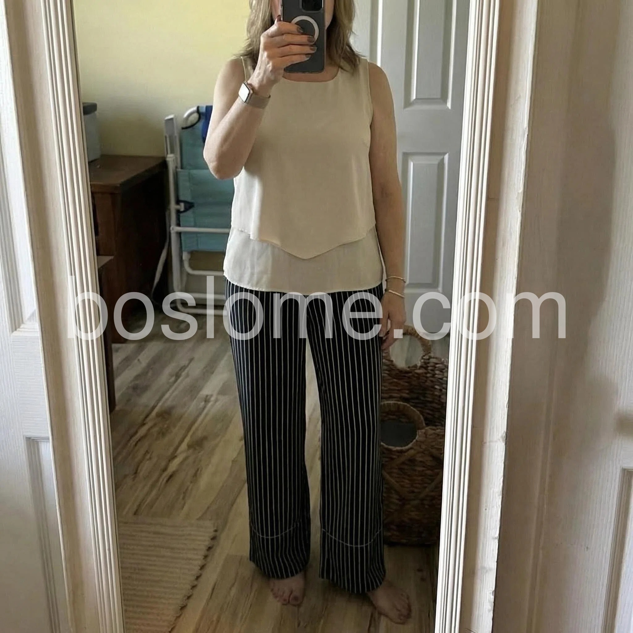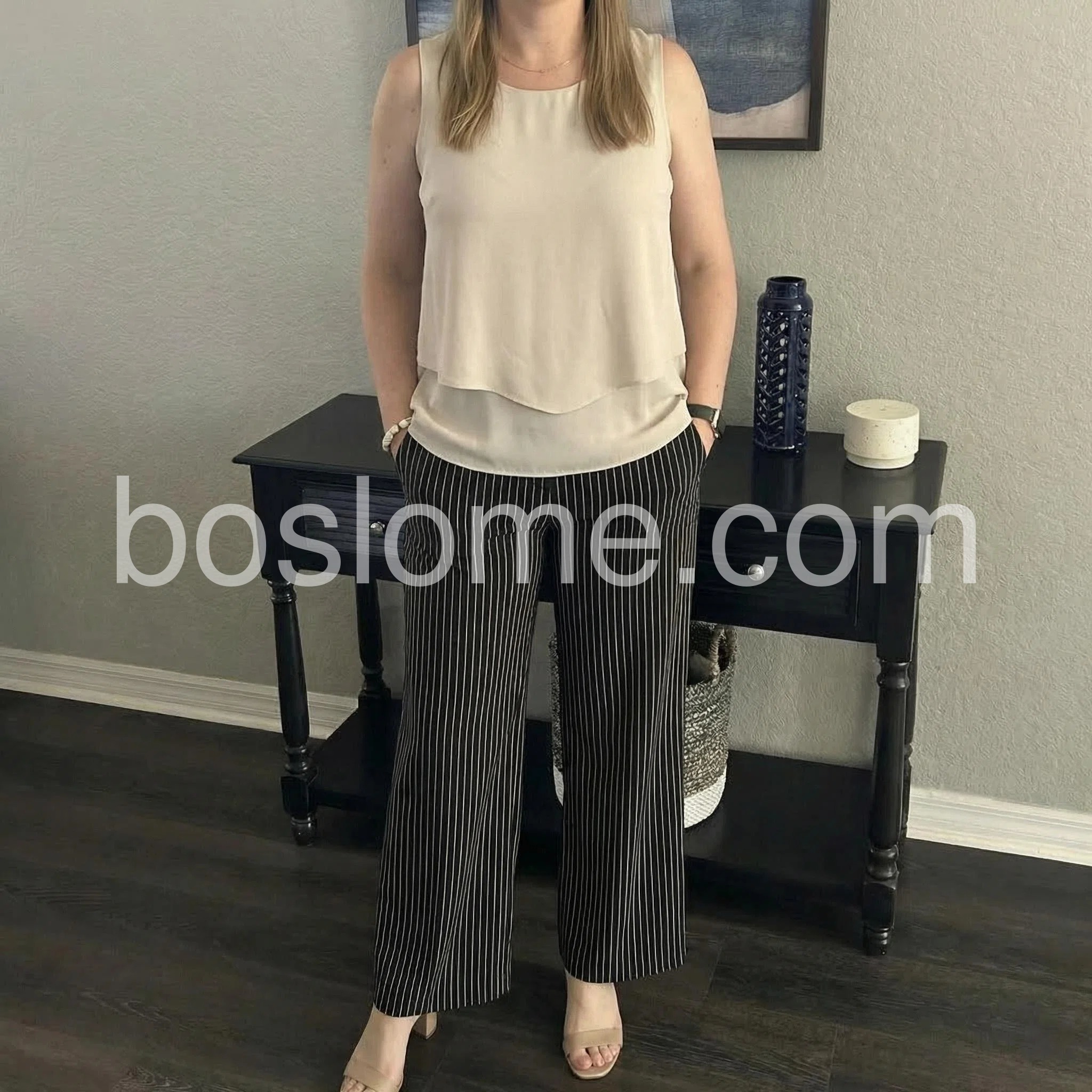 The vertical stripes on these wide-leg pants are incredibly slimming and make me look taller. The contrasting cream top balances the whole look beautifully.