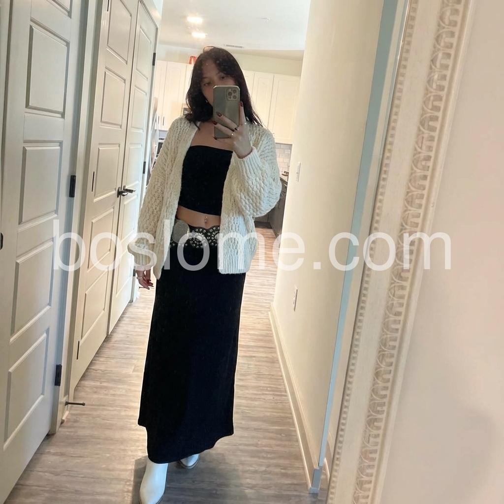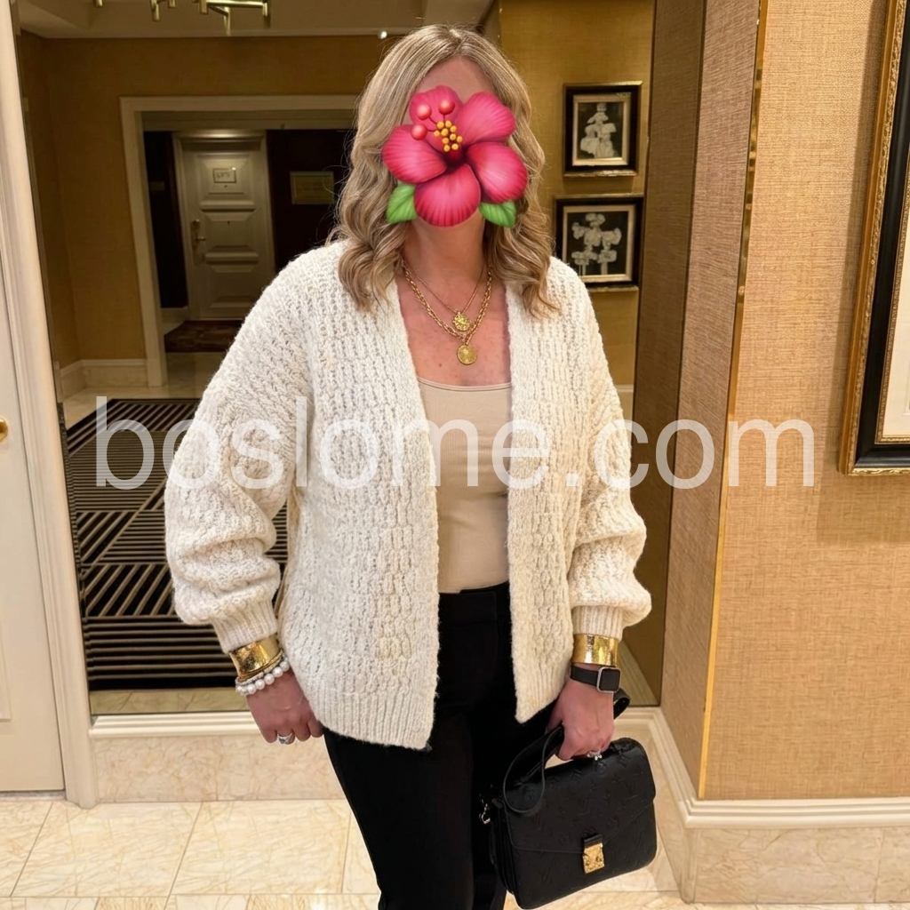 This cardigan is a new favorite of mine. The cable knit detail gives it that timeless, classy look, and it feels very comfortable right away. I also like that it layers nicely over a tank or a fitted top without clinging. Overall, it’s stylish, cozy, and worth every penny.