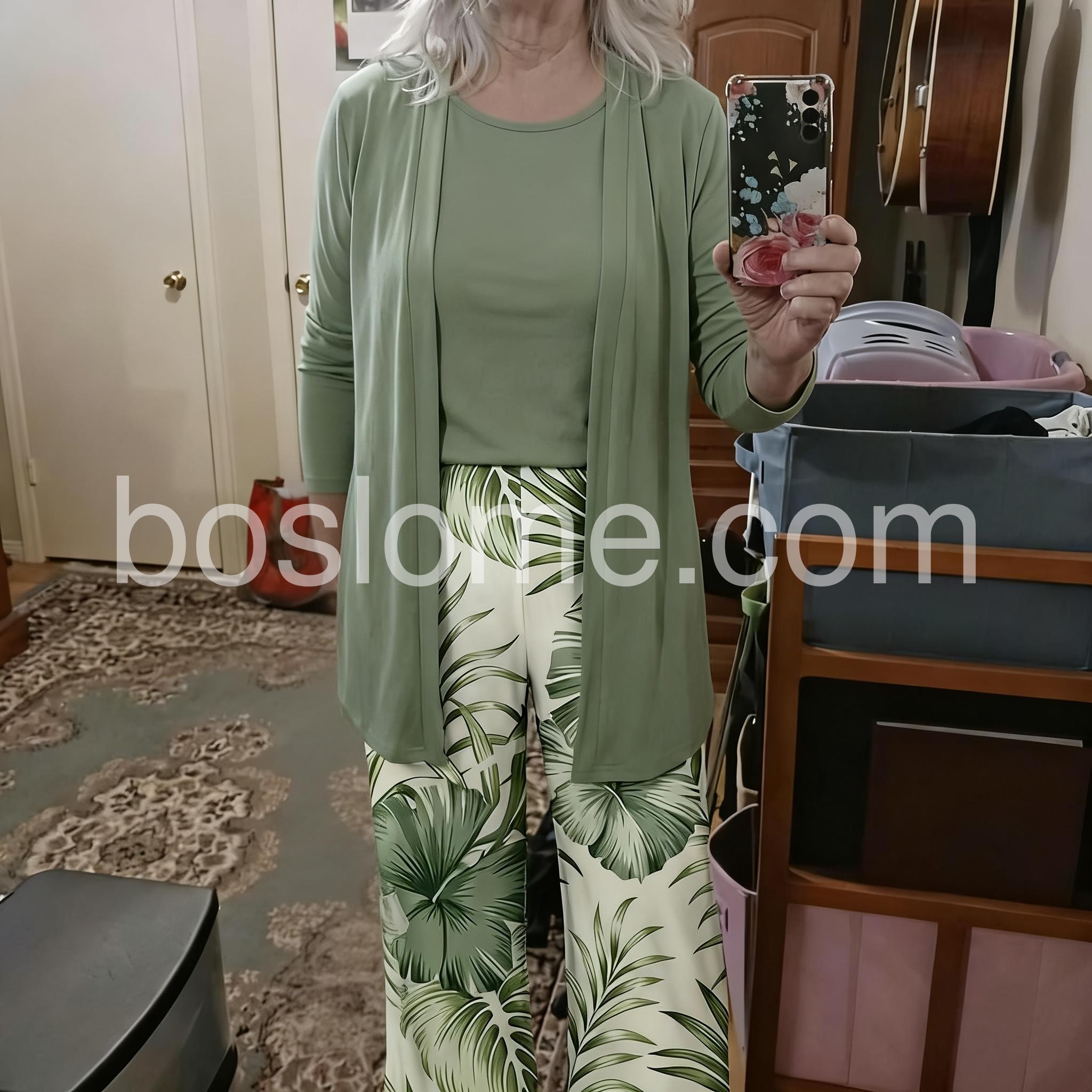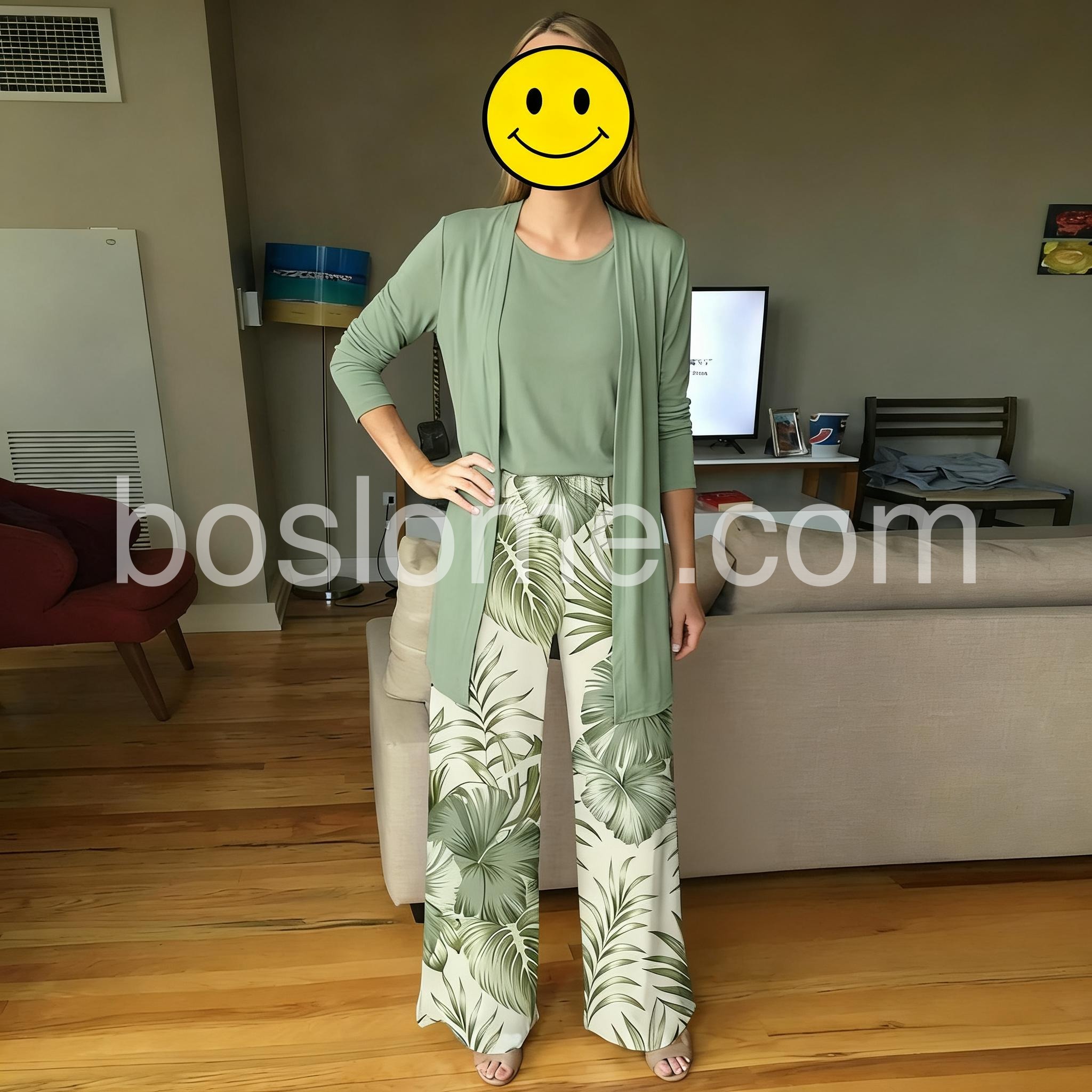 Thisย three-piece setย features a soft sage green drape cardigan with a relaxed fit. Paired with wide-leg pants in a leafy tropical print for a fresh, nature-inspired look. Lightweight fabric ensures comfort and breathability. Ideal for casual outings or warm-weather days. Effortlessly chic with a touch of boho elegance.