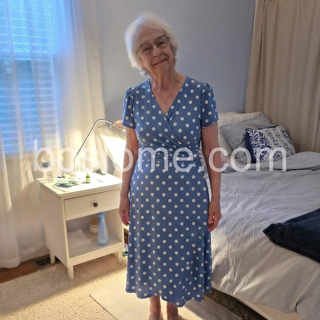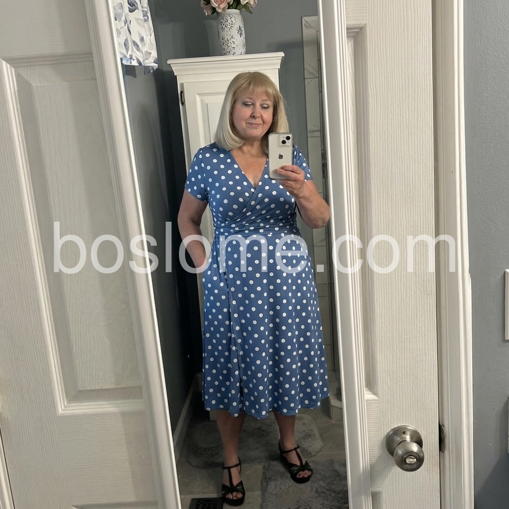 Thisย mid-length wrap dressย features a chic blue base with white polka dots. V-neckline and short sleeves for a timeless look. Fitted waist with flared skirt for a flattering silhouette. Perfect for beach outings or casual events. Sophisticated and effortless style.