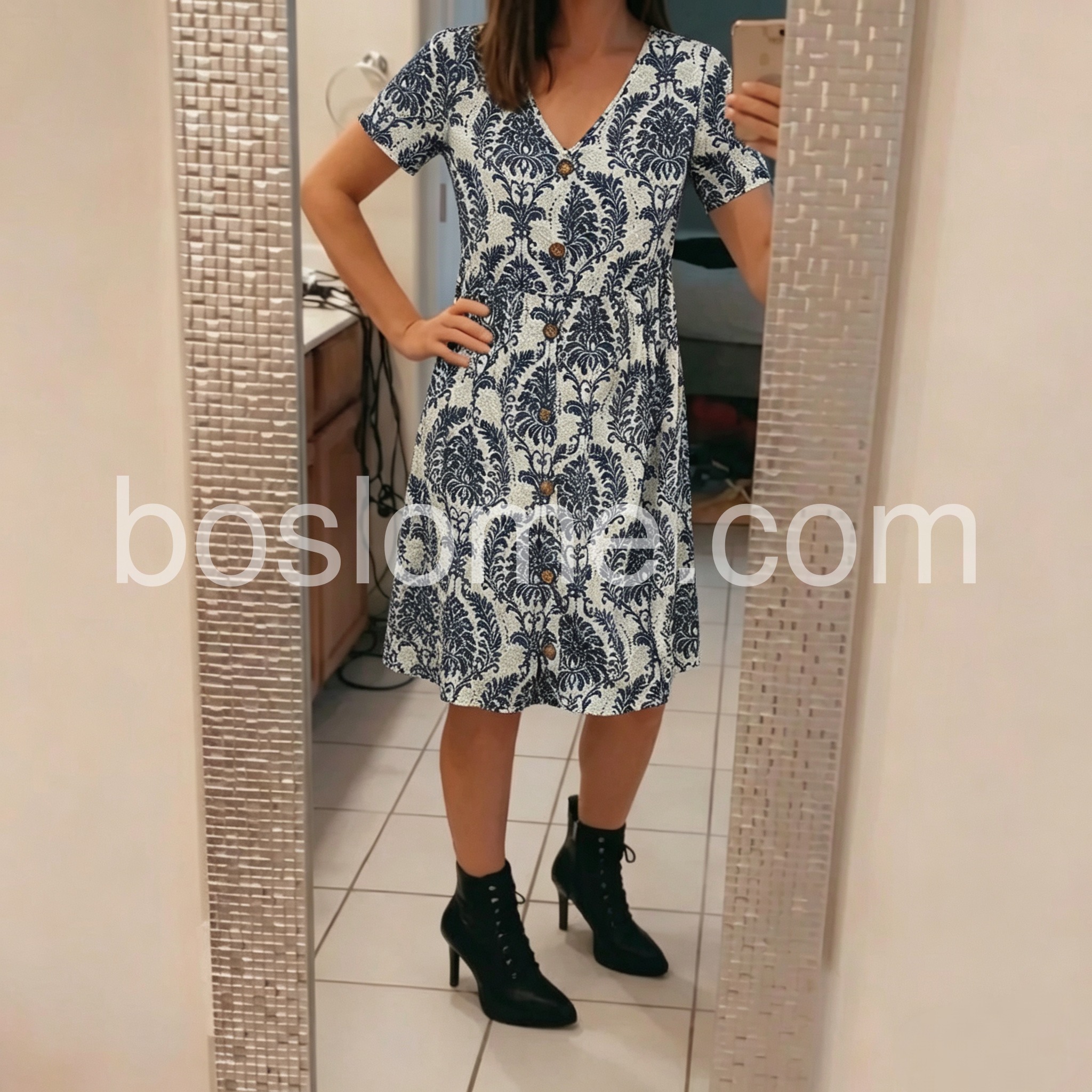 This dress solves the common “frumpy vs. too tight” dilemma in everyday wear. The elegant damask-style floral print in navy and off-white feels timeless and refined, avoiding overly loud patterns that date quickly. The relaxed A-line silhouette skims gently over the hips and midsection, making it comfortable and flattering for all-day wear.