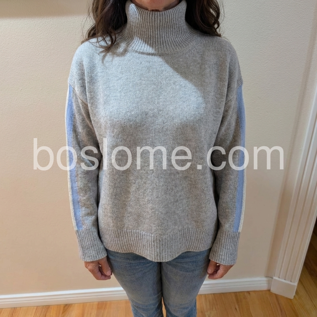 When I first received this grey sweater I wasn't sure if I liked it. One I tried it on I did like it. It fits well and I liked the design of the sweater. I like the high-neck, which isn't too cold. The sweater is comfortable and lightweight for cool days. I think it is a good value for the price.