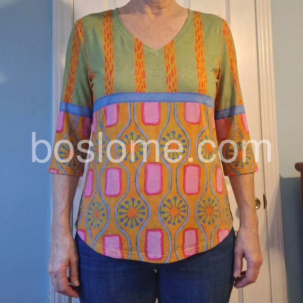 This three-quarter sleeve top features a bold, abstract pattern with geometric and floral motifs. The V-neck design adds a flattering touch. Lightweight fabric perfect for casual wear. Pair with jeans or shorts for a fun, bohemian look. Ideal for warm weather and relaxed outings.