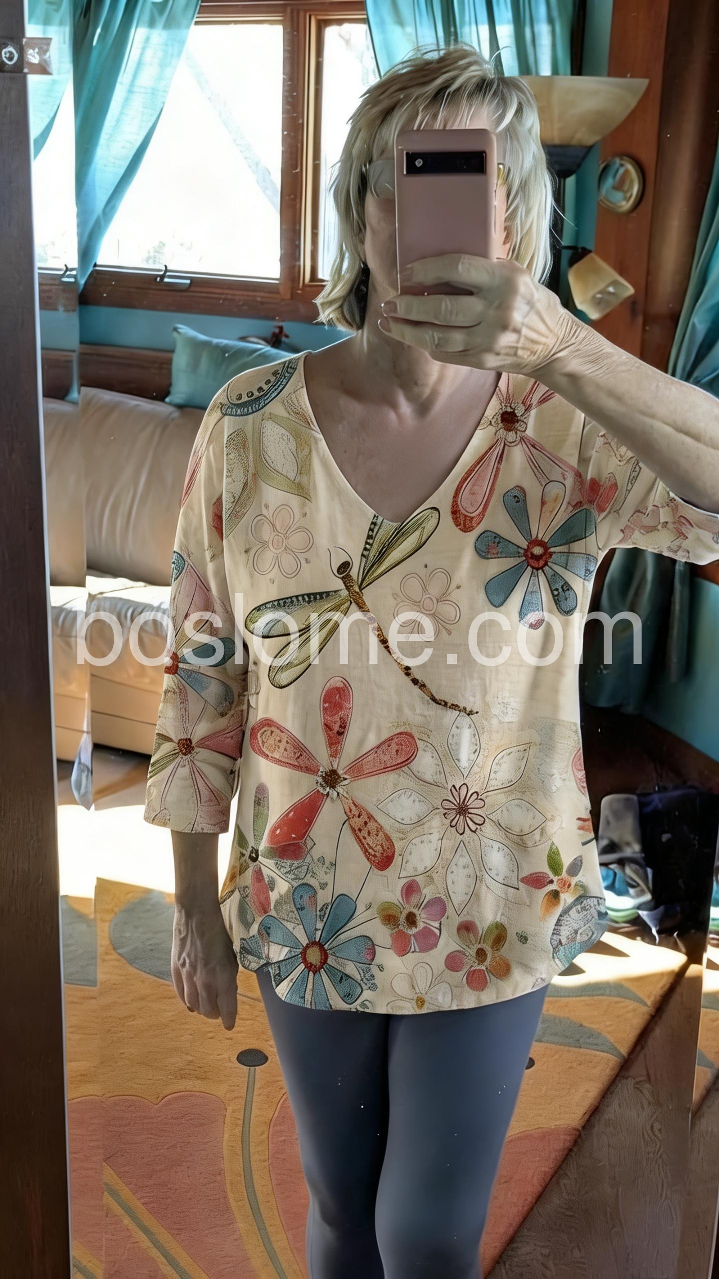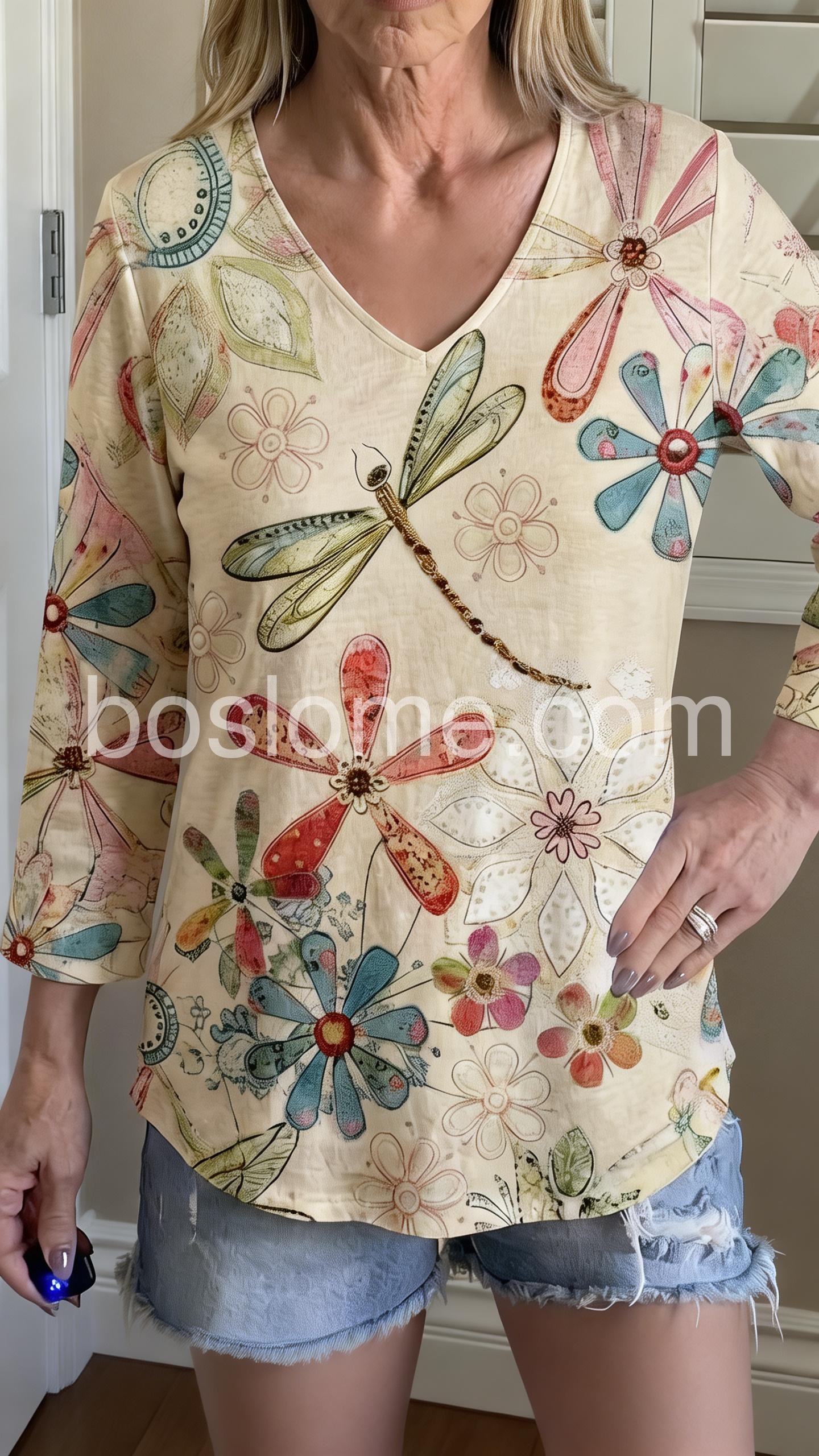 Thisย loose-fitting top features a charming floral and dragonfly print on a soft cream base. With a deep V-neck. Perfect for casual days or bohemian style. Pair with white pants for a fresh, airy vibe. Light, artistic, and full of nature-inspired charm.