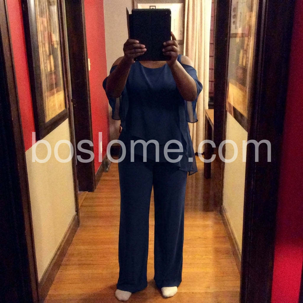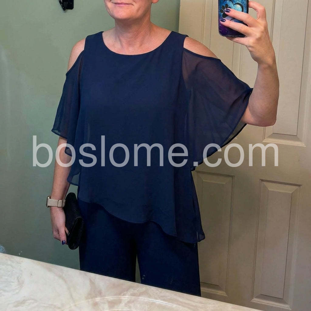 This fashionable two-piece set includes a navy cold shoulder three-quarter length draped sleeves andย asymmetrically layeredย ruffled top and pants. Crafted from lightweight and soft materials, this set is perfect for any occasion. Step up your look with this stylish set.