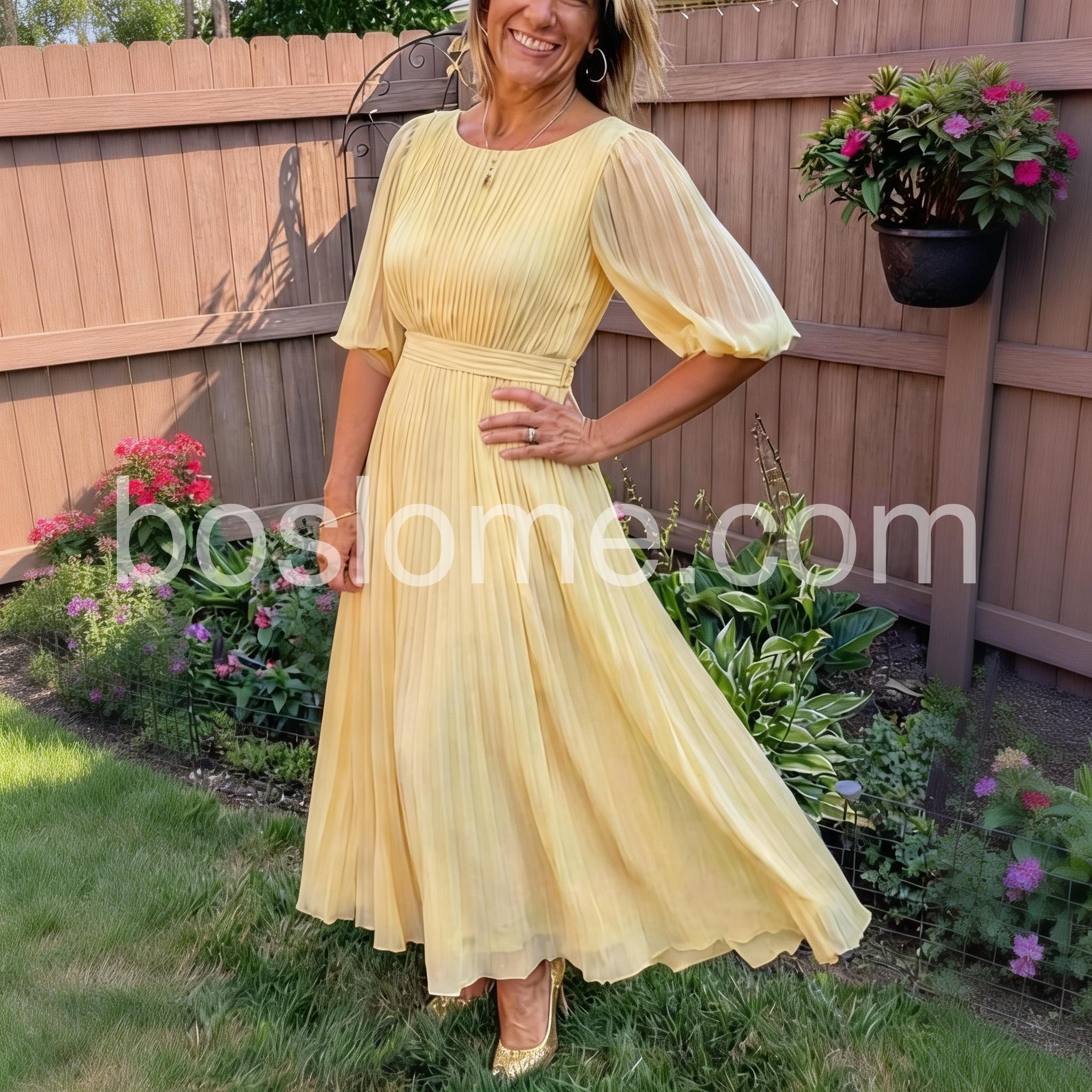 Lovely dress. Material nice. My husband really liked it on me. I also received so many compliments on it! The fit is comfortable and stylish! The yellow color is bright and it is really so beautiful for spring or summer.