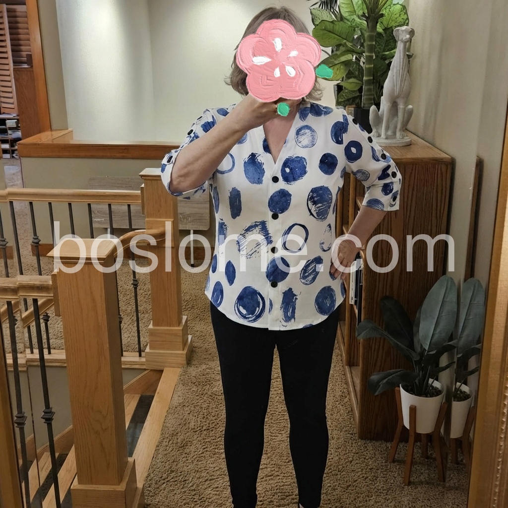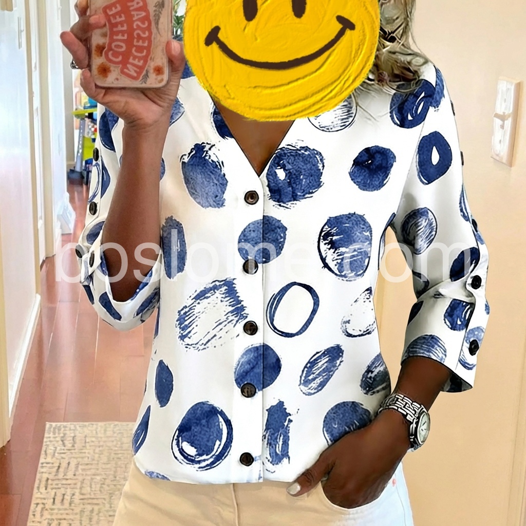Thisย V-neck blouseย features a bold blue abstract dot print on a white background. Button-down front with three-quarter sleeves and button cuffs. Relaxed fit perfect for casual wear. Ideal for pairing with jeans or shorts. Modern and eye-catching design.