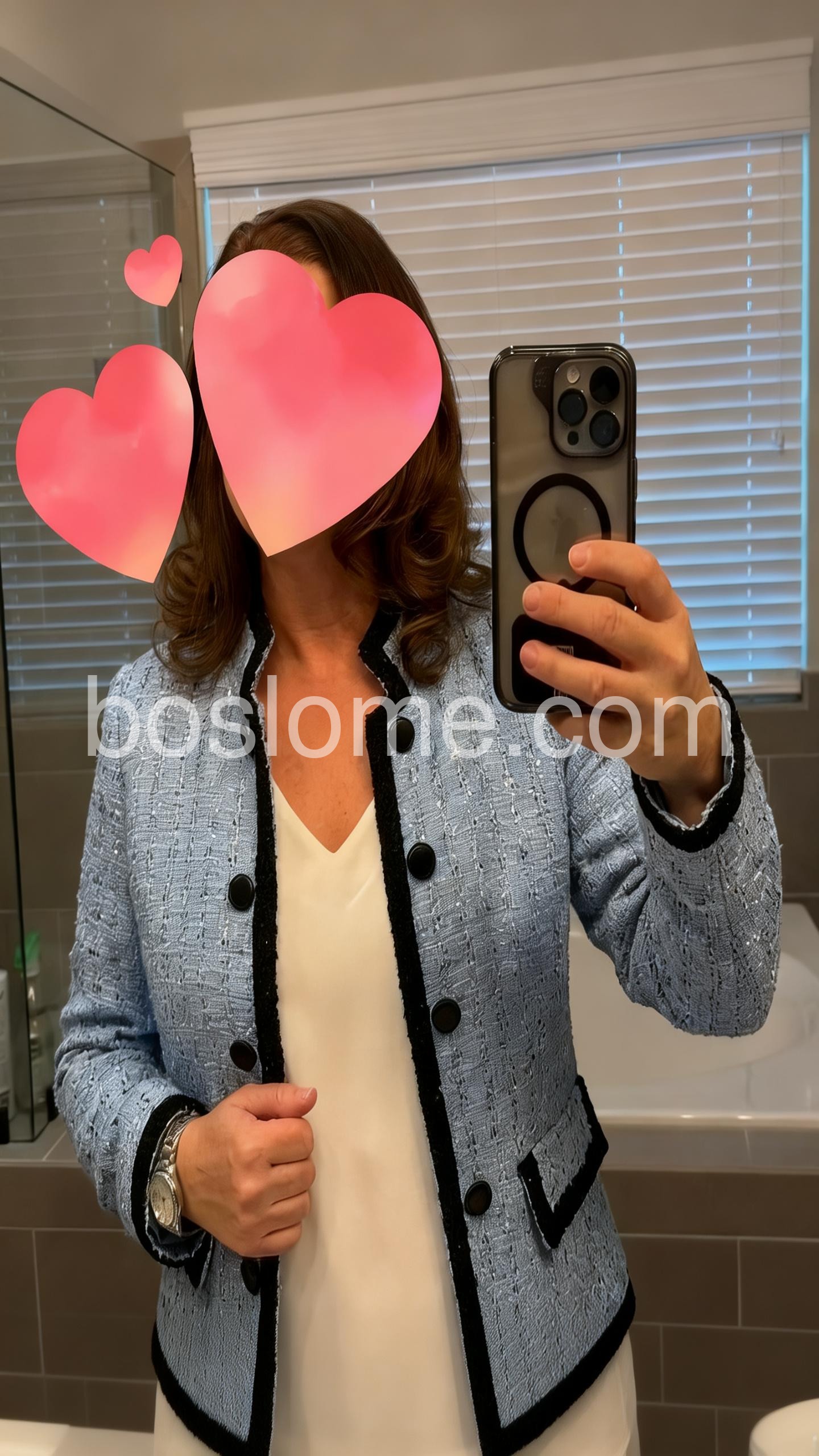 Blue Tweed Blazer With Black Trim And Double Button Design