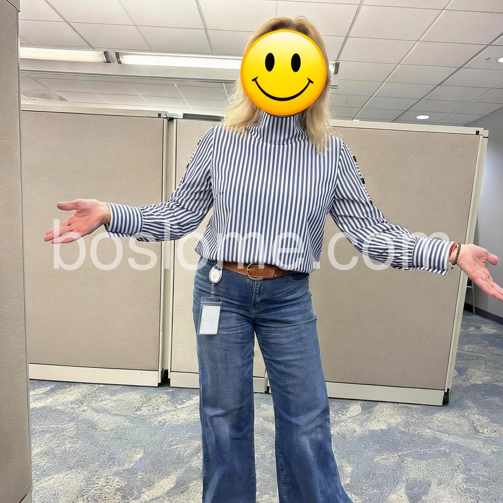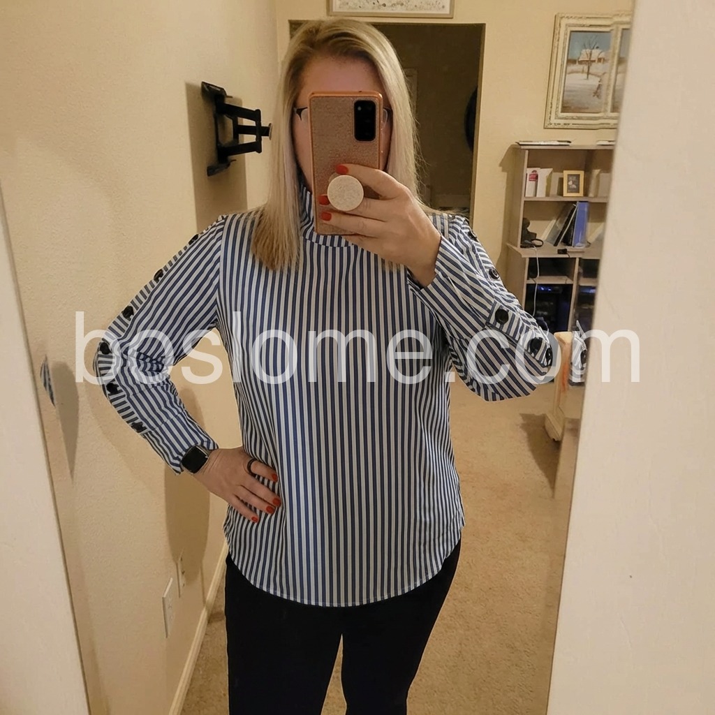Love the blue and white stripes! It looks so professional for work but is comfortable enough for all-day wear. The button details on the sleeves add a really nice touch.