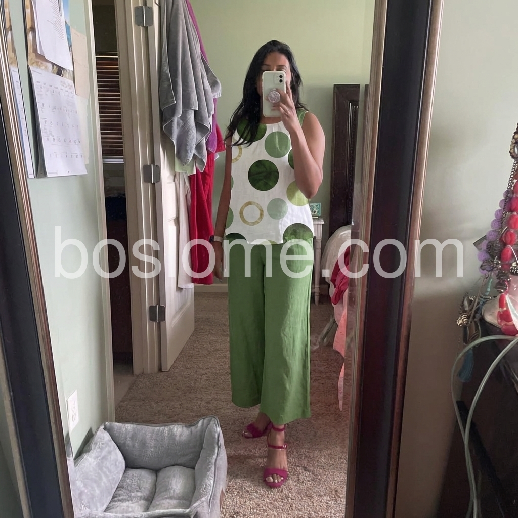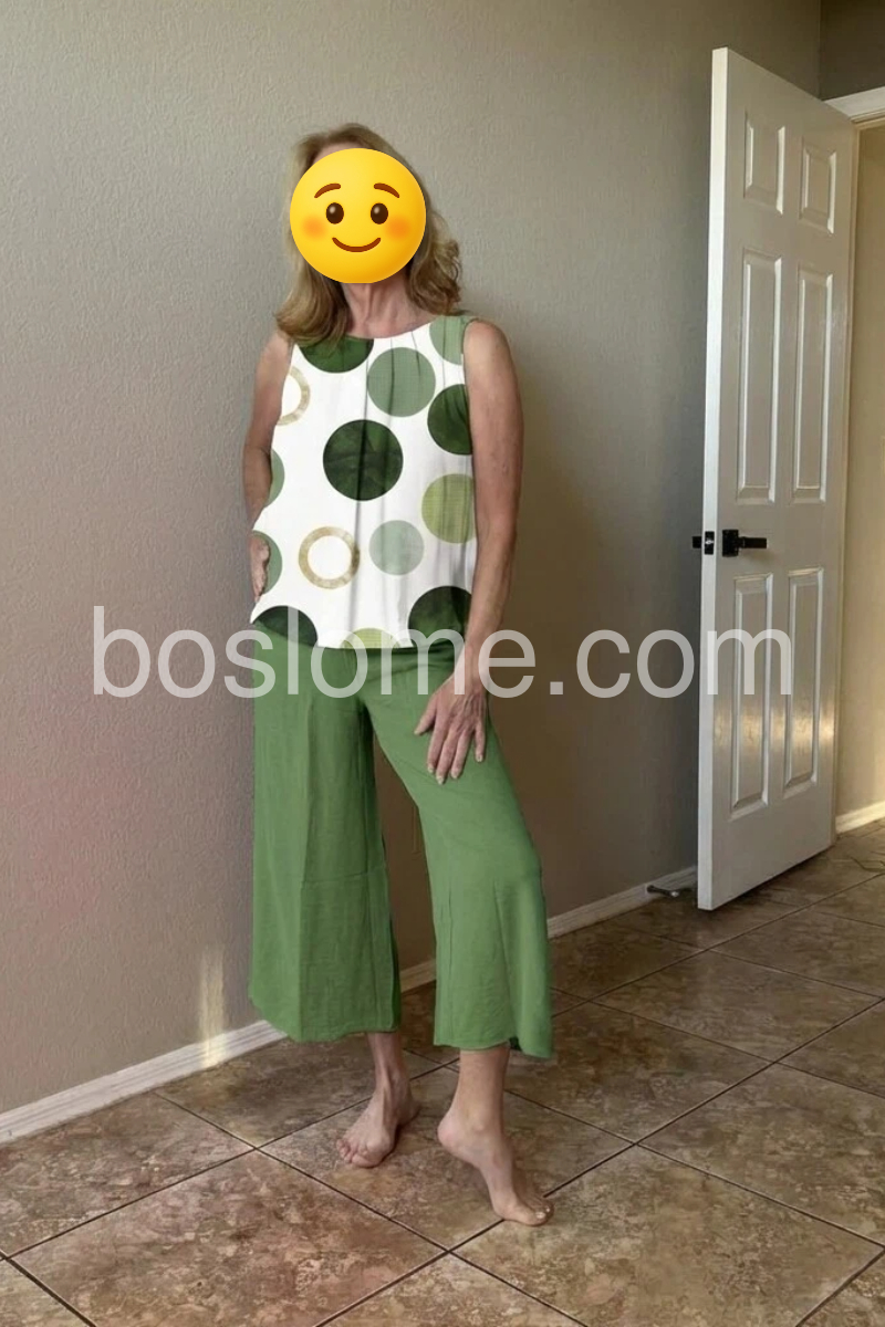 Thisย coordinated setย features a sleeveless top with bold green polka dots on a white background. Paired with solid olive-green wide-leg pants for a clean, contemporary look. Lightweight and comfortable fabric ideal for everyday wear. Perfect for casual outings or relaxed summer days. Stylish and easy to style.