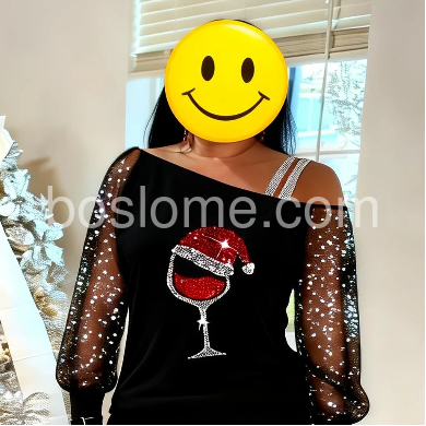 This elegant long-sleeved holiday Christmas shirt features a glittering print of a tipsy red wine glass with a Santa Claus hat, spreading the holiday cheer with a super-fun vibe, ready for par-tay good times! This black off-shoulder asymmetrical shirt features sheer long sleeves elevating this top to a luxe look for any date night. Machine wash cold tumble dry low to medium heat. Iron if needed or lay flat to dry.