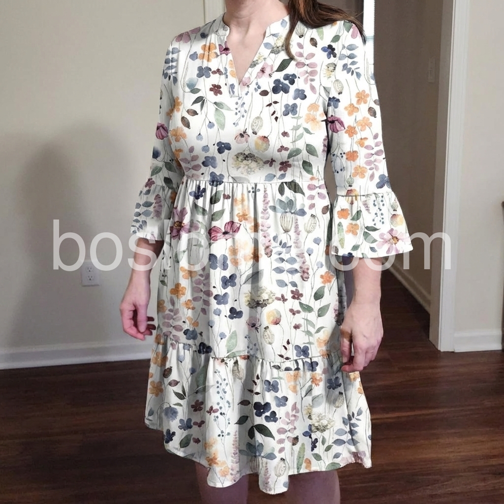 This white floral dress features a V-neck, button-down front, and flared bell sleeves. The tiered skirt adds movement and charm. Soft pastel blooms create a delicate, summery look. Perfect for beach days or casual outings. Lightweight and effortlessly feminine.