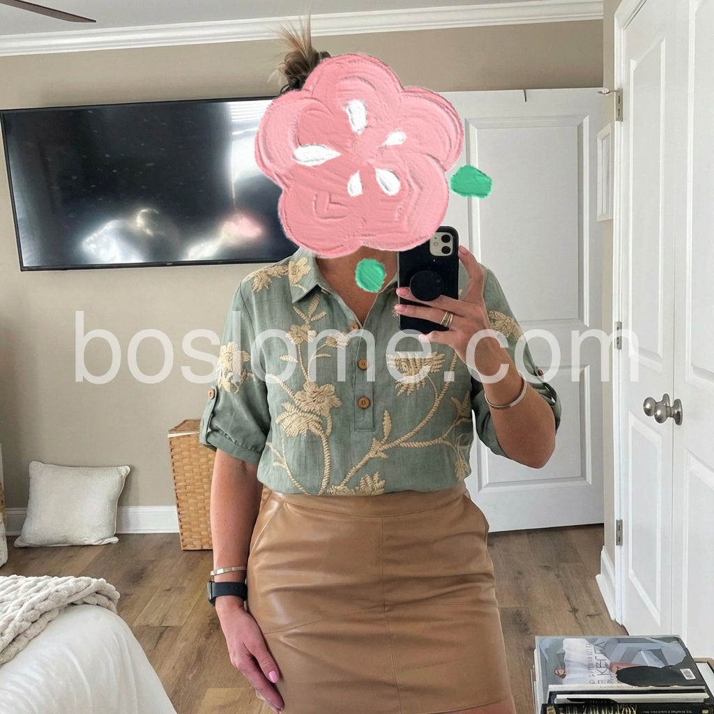 I absolutely love this blouse! The floral embroidery is gorgeous and adds such a nice texture to the top. The sage green color is exactly as pictured. It fits true to size and the linen-like material is perfect for warm weather. Highly recommend!