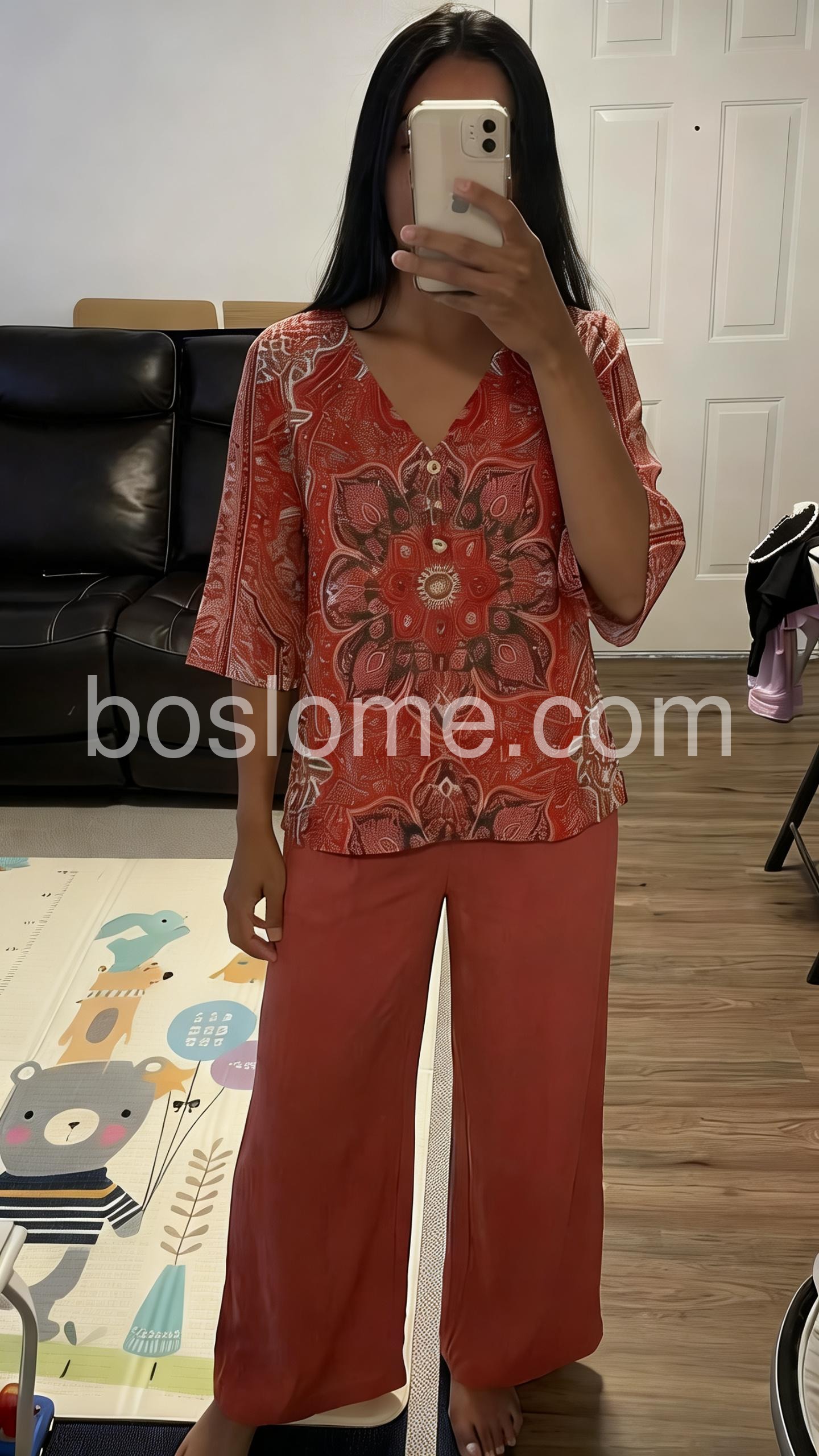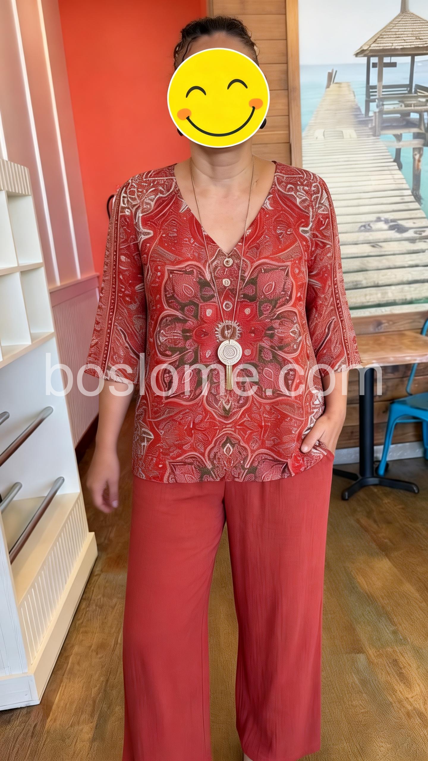 Thisย coordinated setย features a V-neck top with a bold mandala print and matching solid wide-leg pants. The relaxed fit ensures all-day comfort. Soft fabric perfect for warm weather. Ideal for casual outings or stylish days out. Effortlessly chic with a bohemian flair.