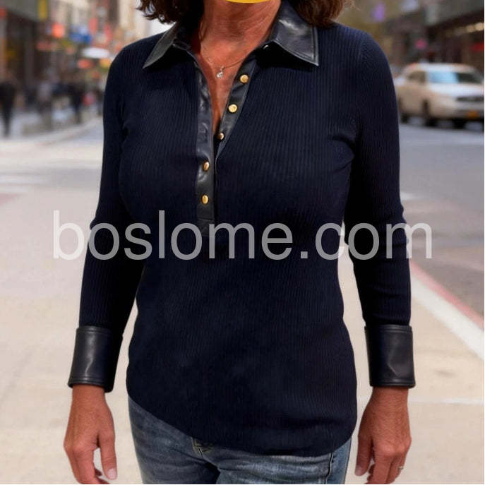 Chic Long Sleeve Faux Leather Trim Slim Fit Top