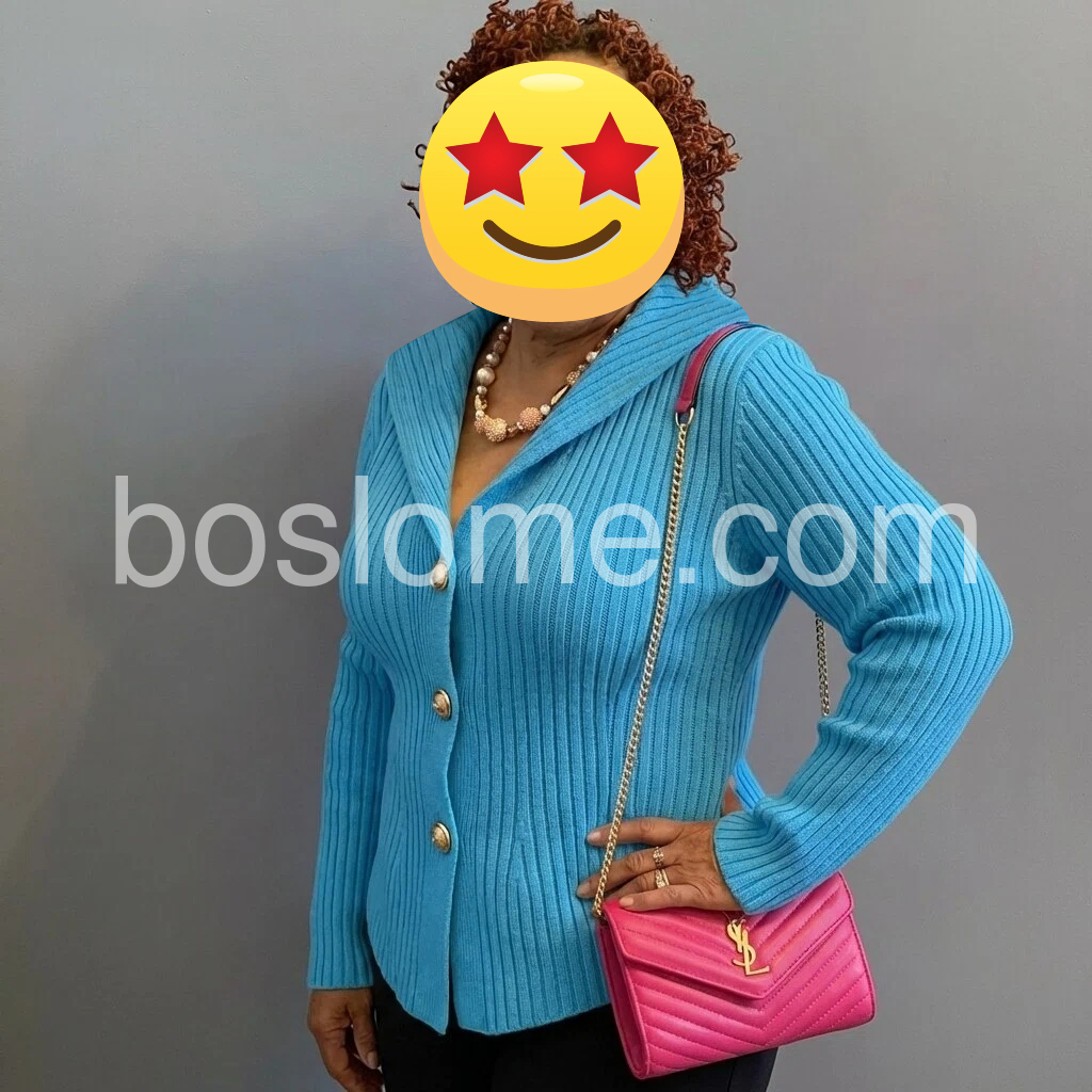 I absolutely love this sweater! The bright turquoise color is perfect for adding a fun touch to my outfits, and the ribbed knit is so soft and warm. The asymmetrical buttons are such a unique design element, and the slim fit is really flattering. It’s easy to dress up with a skirt or dress down with jeans, making it a versatile staple. The fabric is high quality and holds its shape well. Definitely worth buying!