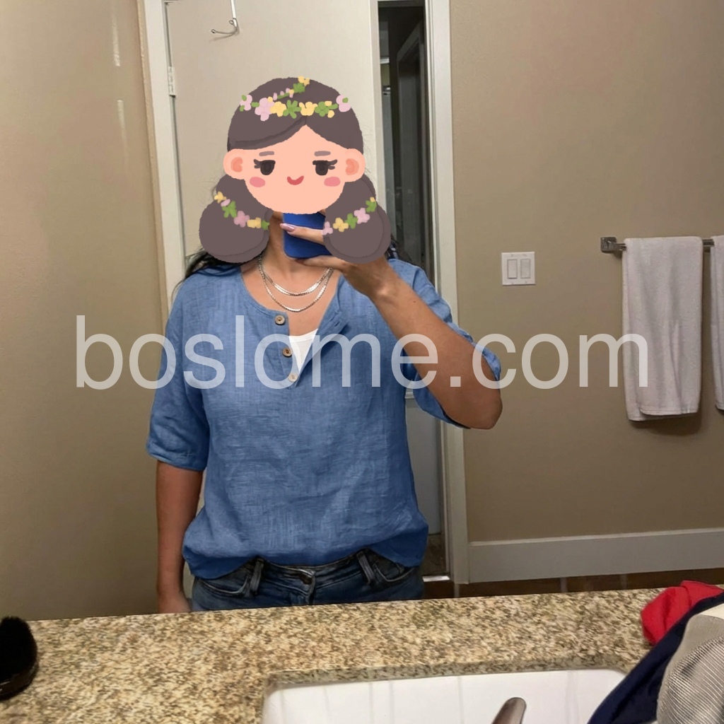 The button details on the V-neck give it a nice touch. Not too low cut, very modest, lightweight, and super comfortable.