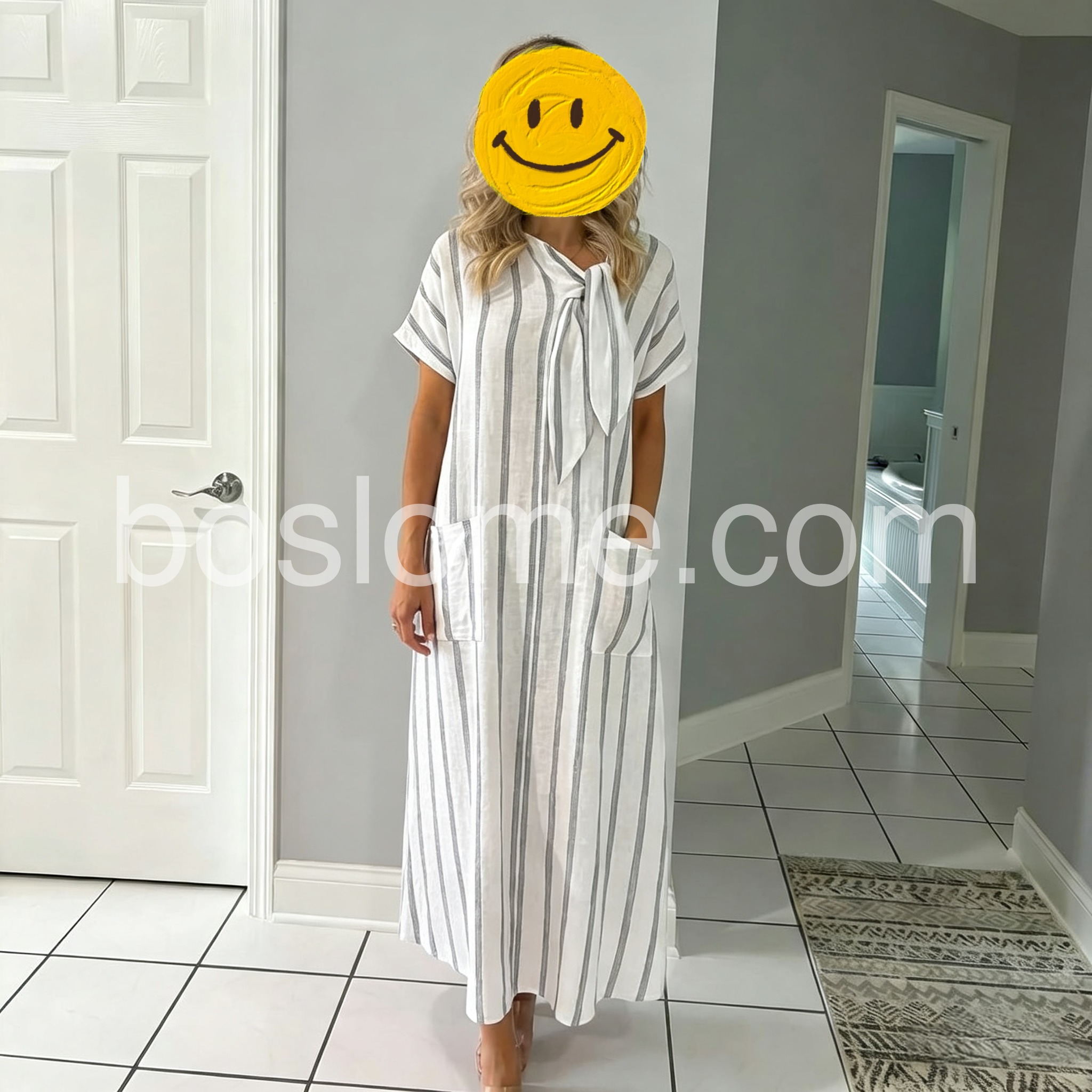 Gray White Stripe Tie Neck Pocket Maxi Dress