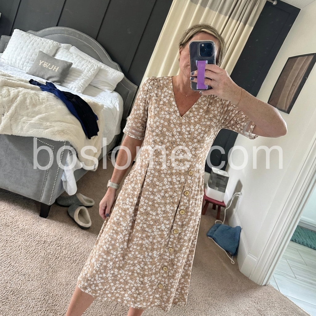 This midi dress brings soft, understated charm to your wardrobe. The warm khaki base, printed with tiny white florals, feels endlessly versatile.
