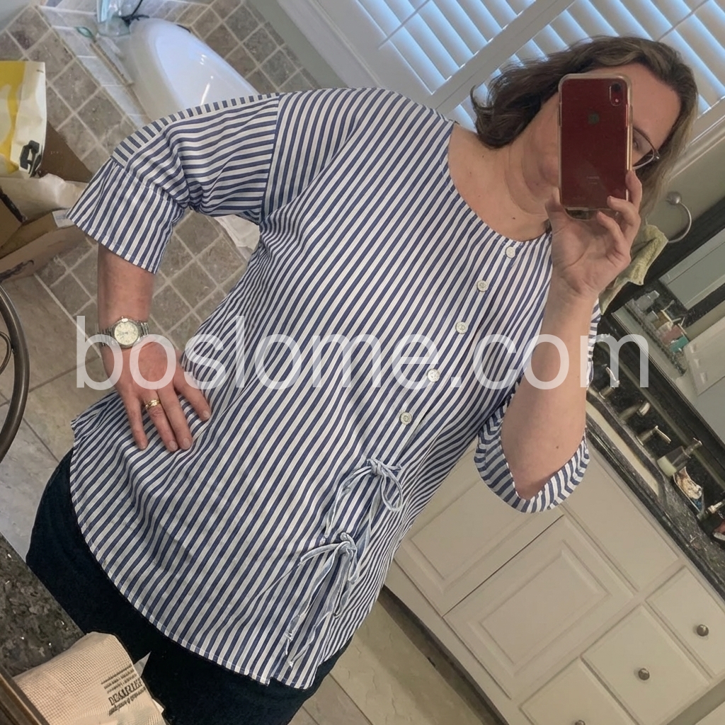 Thisย loose-fit topย features vertical blue and white stripes with a clean, casual look. Round neckline and front button-down design for easy wear. Side ties add a feminine touch. Three-quarter sleeves with rolled cuffs. Perfect for everyday comfort and effortless style.