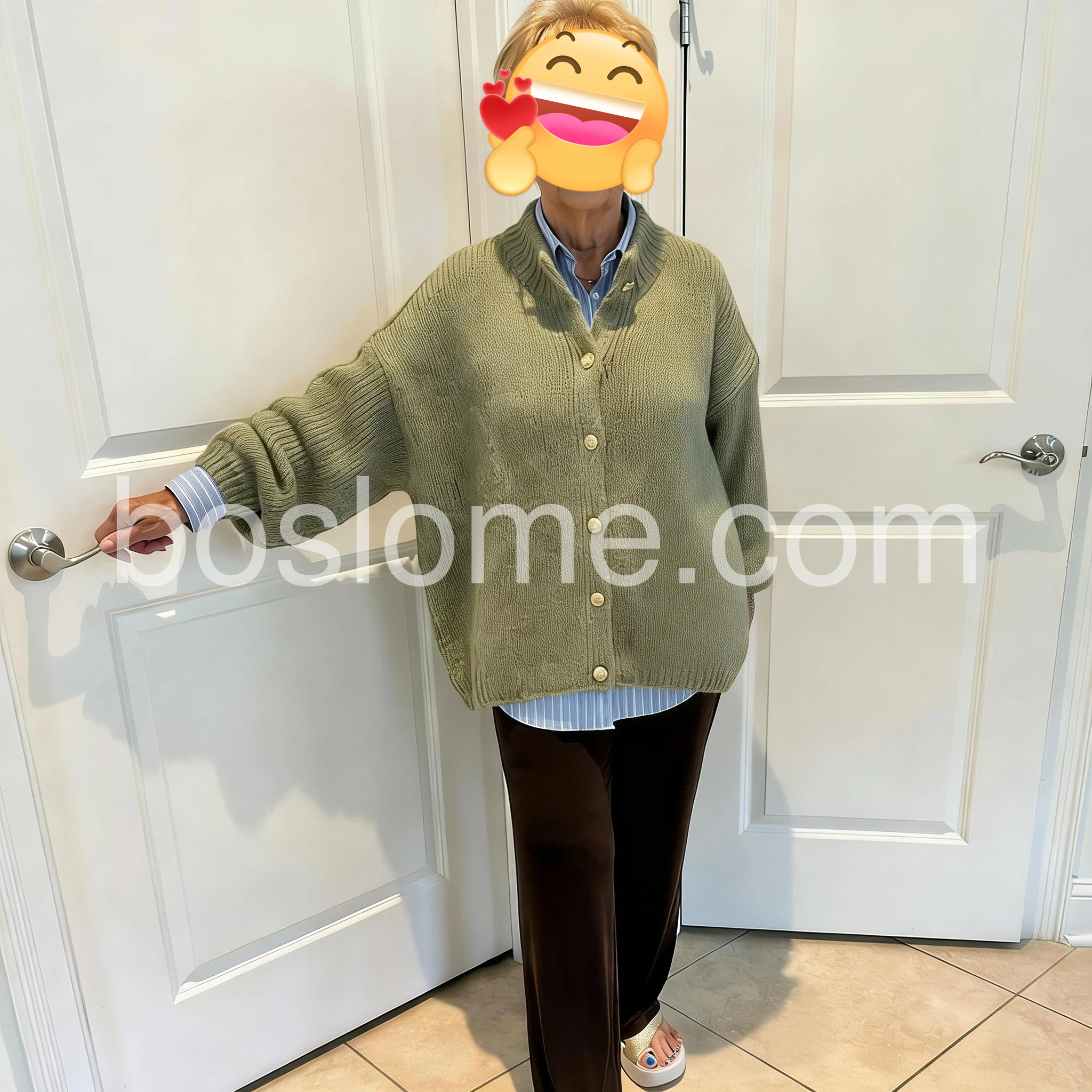 This cardigan is the definition of comfort and style! The thick fuzzy knit keeps me warm without being bulky, and the oversized silhouette is so flattering on all body types. The high neckline with gold buttons adds a polished touch, and the batwing sleeves give it a trendy, laid-back feel. It’s the perfect piece to throw on over any outfit for an instant cozy chic look, and the sage green is such a timeless color. I’ll be wearing this all winter long!