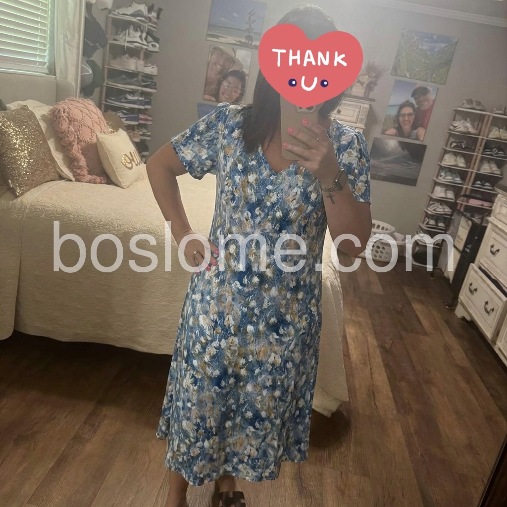 Absolutely love this dress! The blue and grey floral pattern is gorgeous in person. It has a beautiful flow to it and the material feels very light and breathable. Perfect for my upcoming beach vacation.
