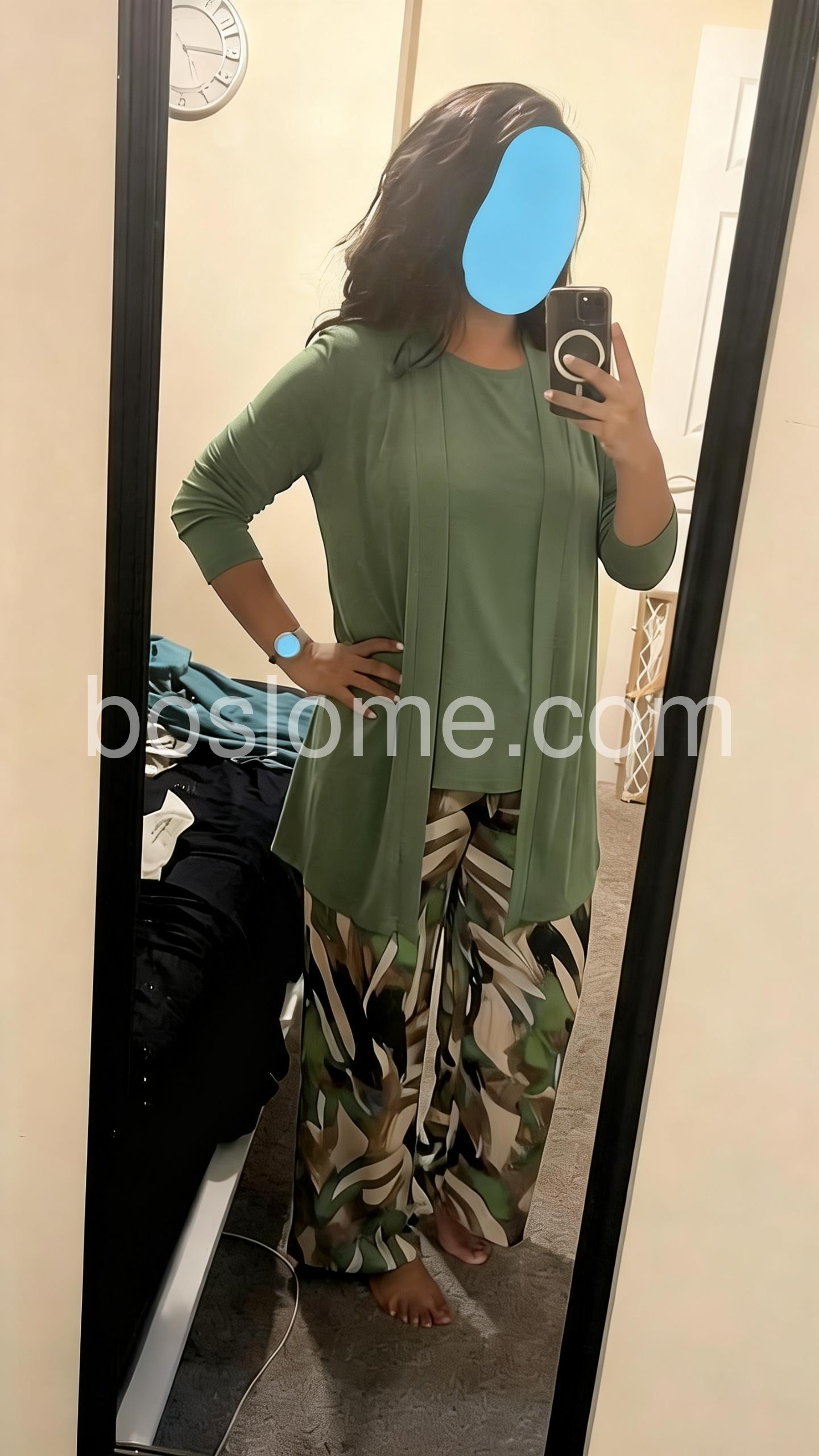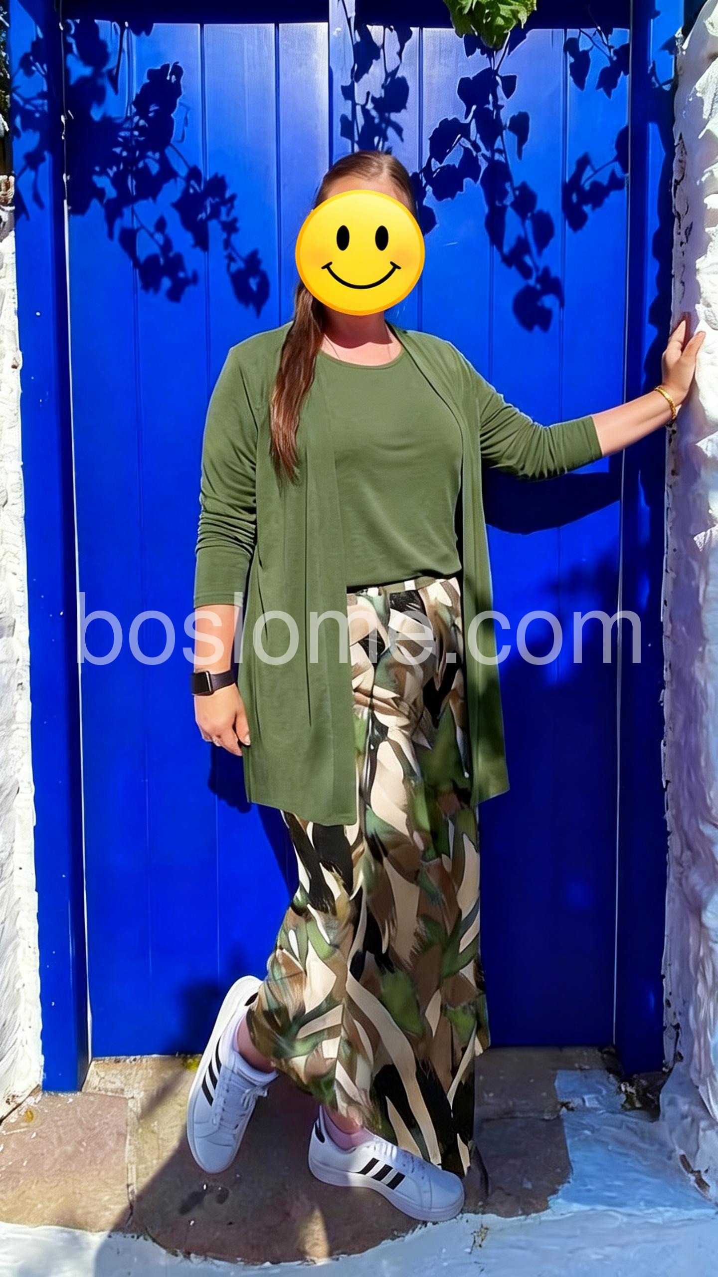 Thisย three-piece setย features a solid green top, matching open-front cardigan, and wide-leg pants with a bold tropical leaf print. The relaxed silhouette offers comfort and style. Perfect for casual outings or warm-weather wear. Lightweight fabric ideal for everyday elegance. Effortlessly chic and easy to wear.