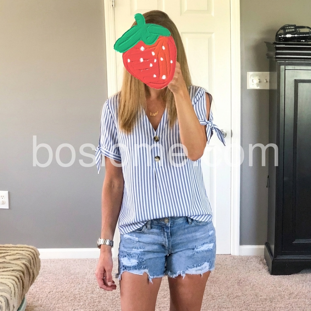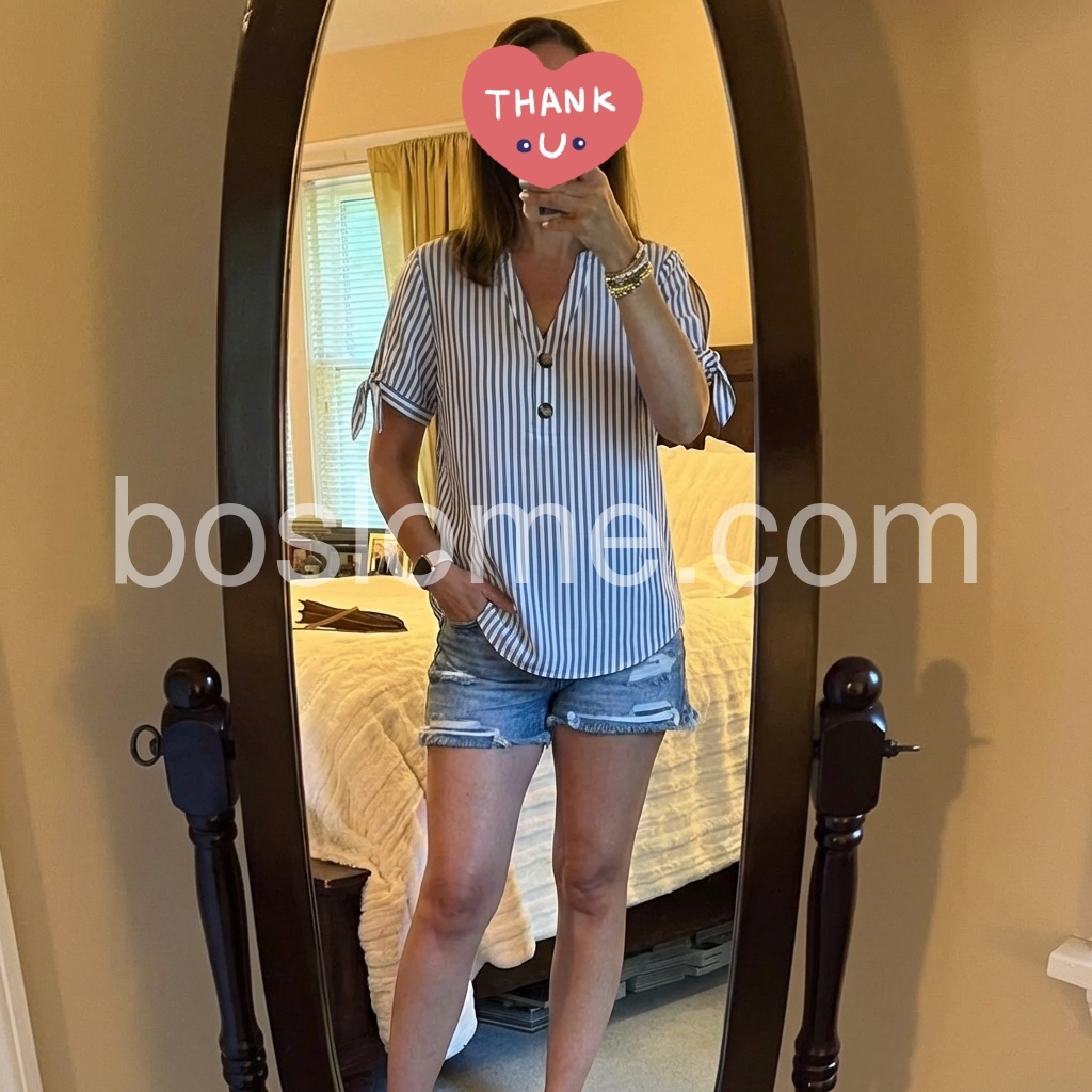 Thisย short-sleeve topย features vertical blue and white stripes. V-neckline with front button closure for a clean look. Side cut-outs with tied sleeves add a trendy touch. Relaxed fit for comfort and ease. Perfect for casual summer outfits.