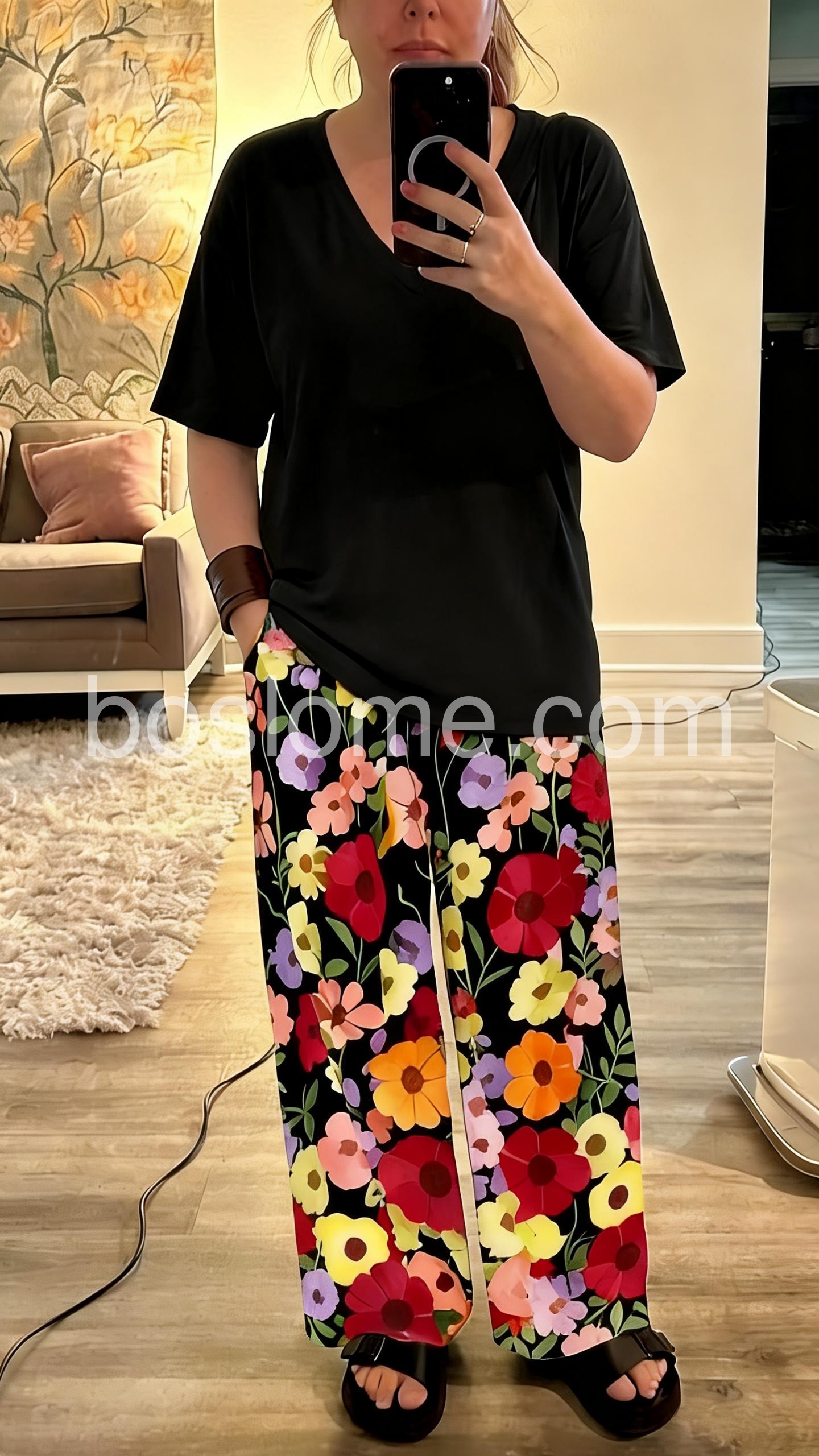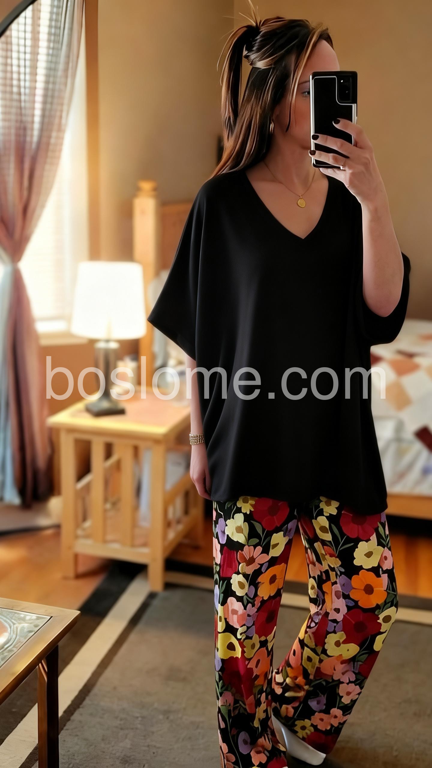 Thisย coordinated setย features a loose-fitting black V-neck top and wide-leg pants with colorful floral prints. The contrast creates a lively, eye-catching look. Lightweight fabric perfect for warm days. Ideal for casual outings or relaxed summer wear. Comfortable and effortlessly stylish.