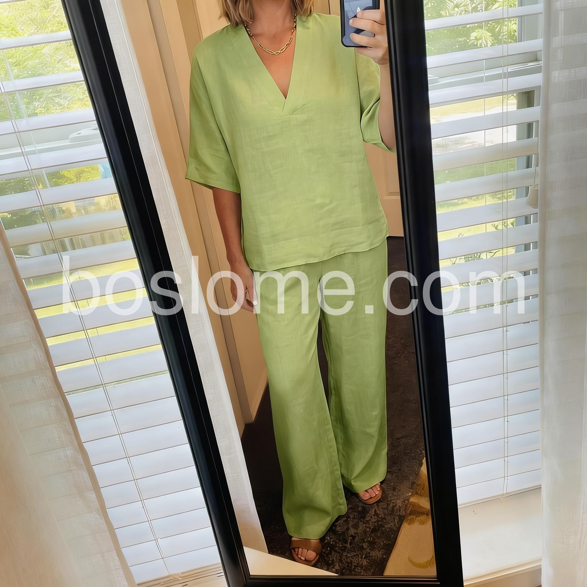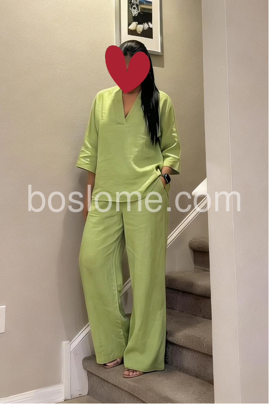 Thisย coordinated setย features a relaxed V-neck top and wide-leg pants in soft, breathable linen. The solid lime green hue offers a fresh, natural look. Perfect for warm weather and casual wear. Ideal for beach days or effortless everyday style. Comfortable and elegantly simple.